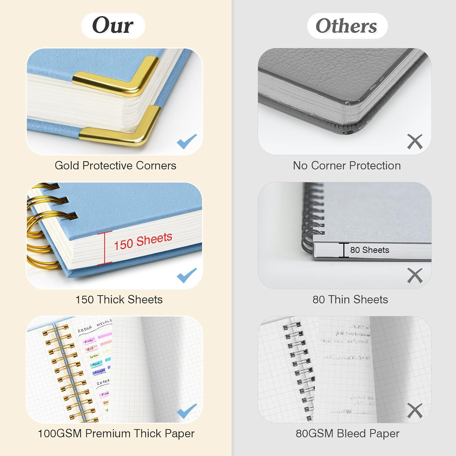 • 【Premium Leather Cover & Strong Binding】Spiral notebook showcases a luxurious leather hard cover, complete with golden corner protectors for extra durability. Its professional design not only looks stylish but is built to last. The strong metal double spiral binding allows for a full 360° lay-flat design, making writing more comfortable and efficient. Whether flipping through or laying the Subject notebook flat, this design guarantees a smooth writing experience.