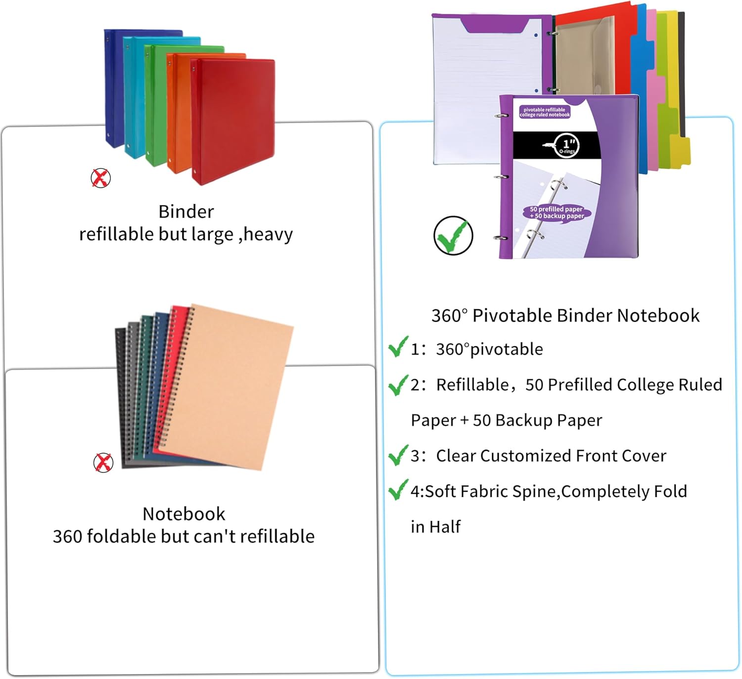 - This is a brand-new designed useful and functional binder notebook. This notebook's biggest feature is that the internal paper and dividers can rotate 360 degrees. This college-ruled notebook works like a binder, allowing you to add and remove pages easily. You can fold it back like a spiral notebook and lay flat writing.