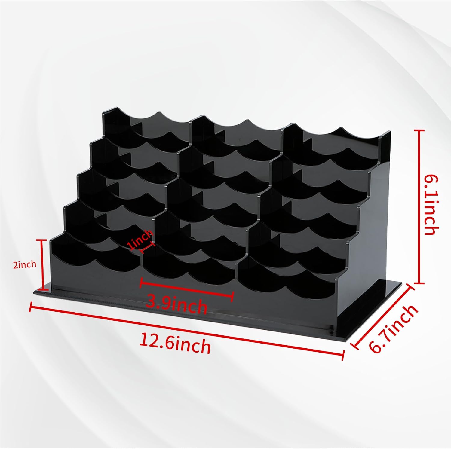 - STURDY CARD STAND - This acrylic desktop business card holder is built to last. Measuring 12.8 inches in length, 6.8 inches in width, and 6.4 inches in height,5 tiers 15 pockets, it can sit securely on any counter or desktop. This make it perfect for a variety of settings, including small businesses, individual departments, reception desks, and trade shows.