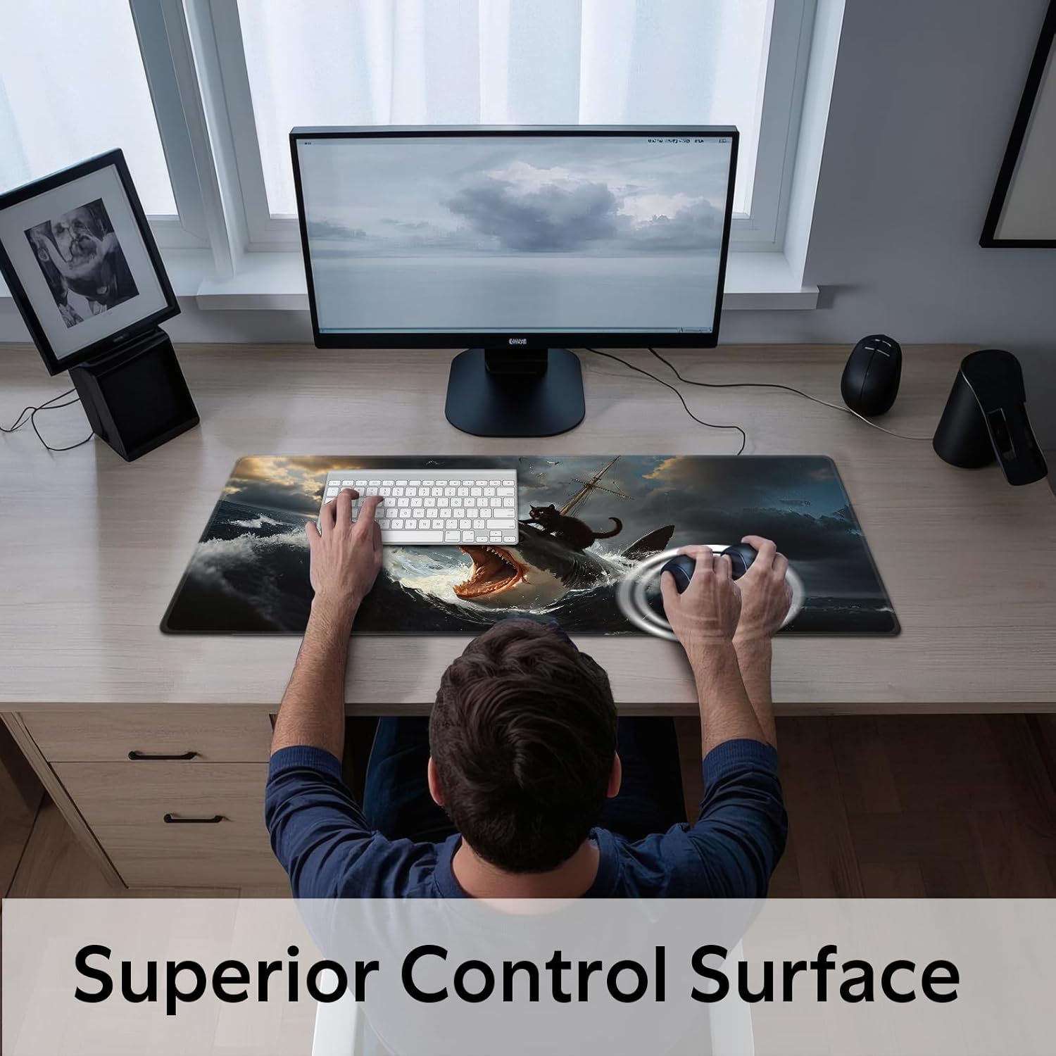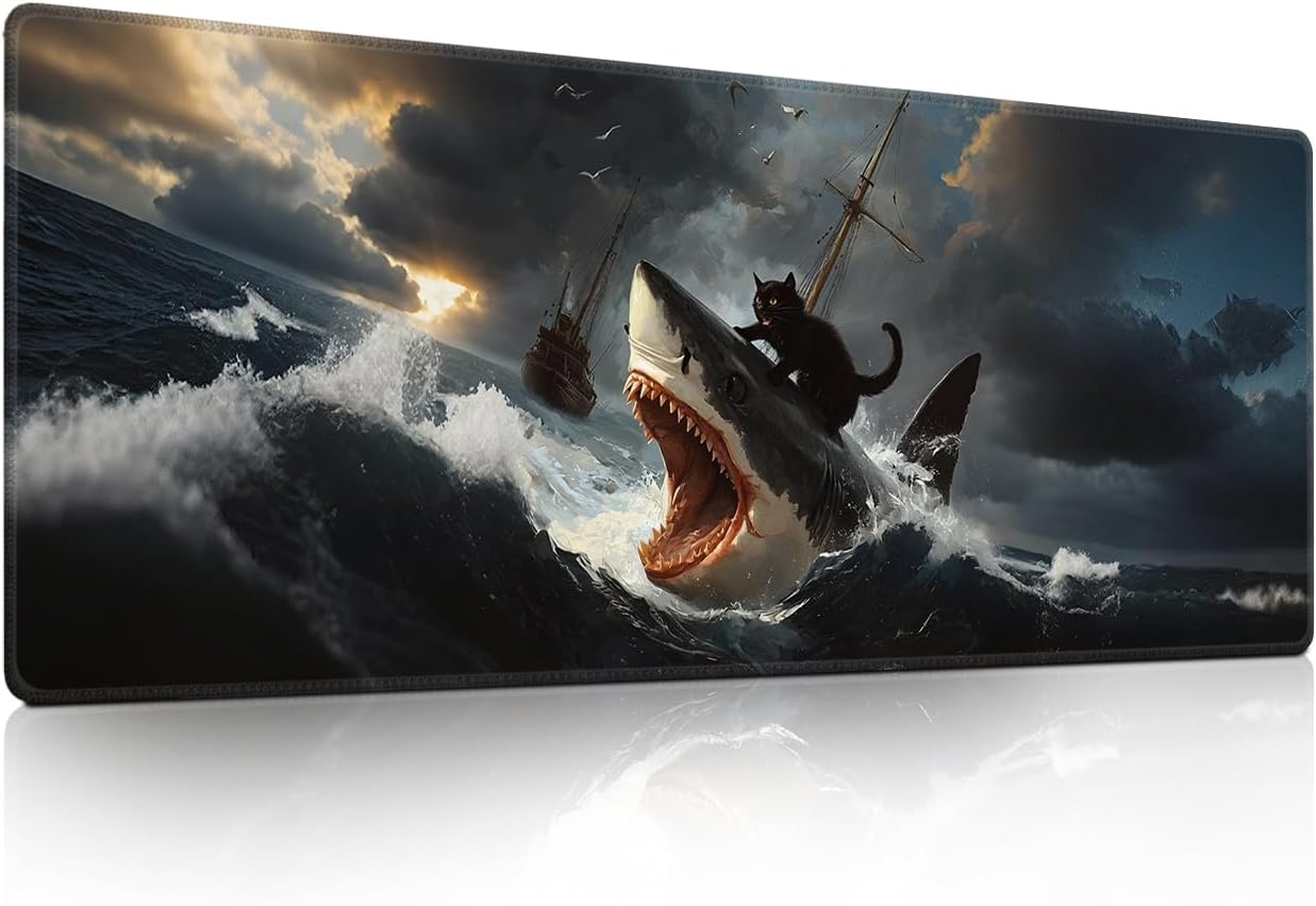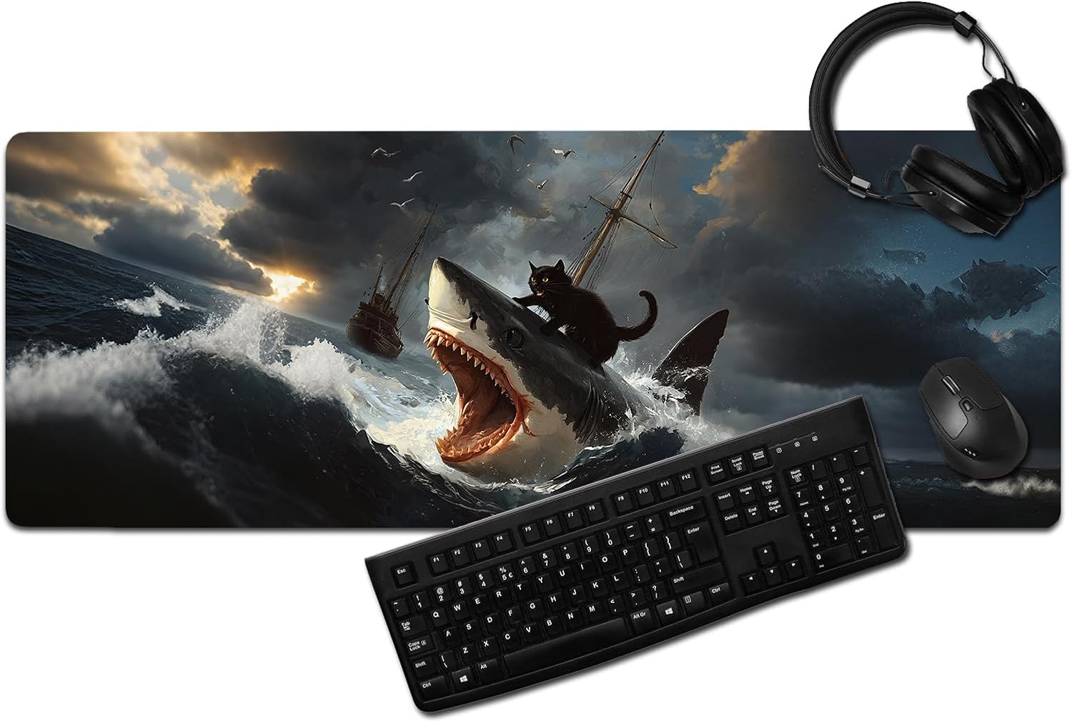 Funny Black Cat Mouse Pad, Abstract Quirky Cat and Shark Mousepad - Large Non-Slip Desk Mat for Office, PC & Laptop - 31.5"x11.8" x 3mm