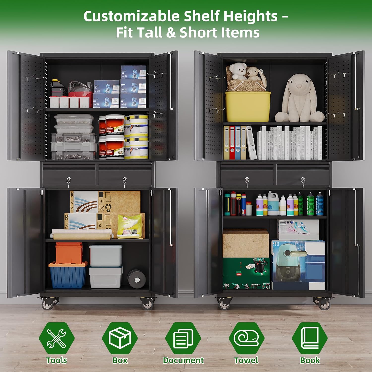 - ăAdjustable Shelvesă Garage storage cabinet with Wheels has 2 adjustable shelves. The shelves can be adjusted up and down to the desired position for your household items, tools, and other items.