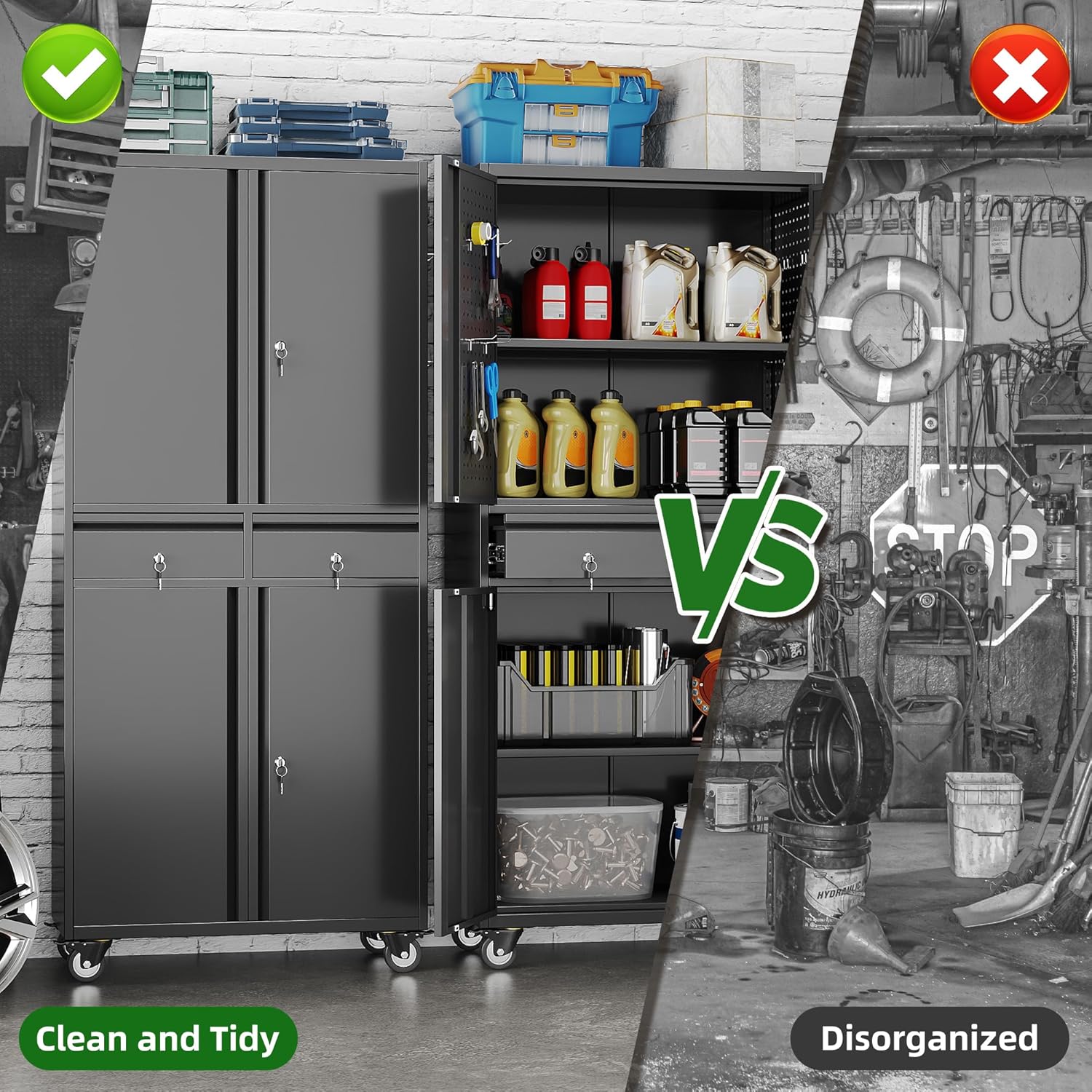 - [Swivel Wheels with Lock] Garage storage cabinet with Wheels has 4 lockable wheels,you can move them around as needed and the casters and wheels work great on all the different surfaces,besides the wheels can be locked and you can fix the cabinet where you want to place.