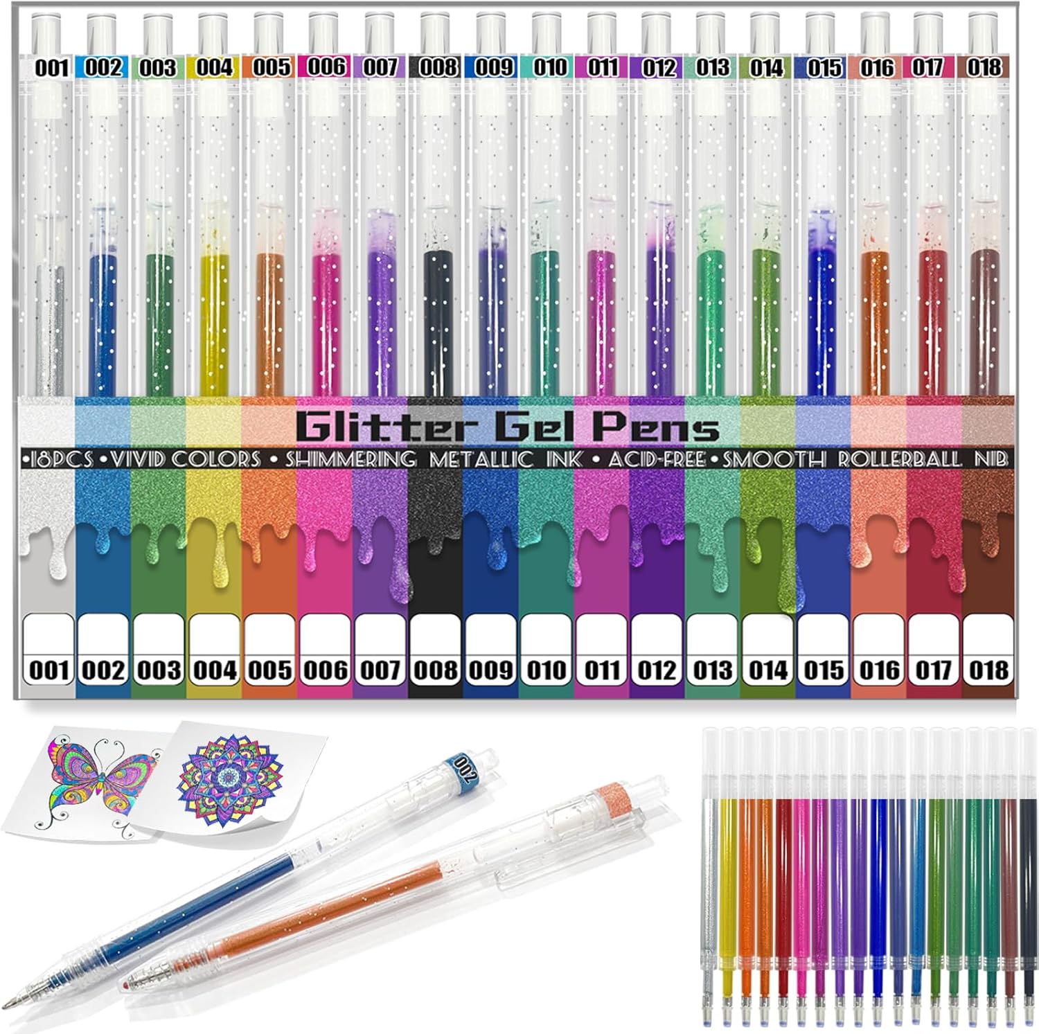 Glitter Pens 18 Colors with 18 Extra Refills, Retractable Metallic Colored Gel Pens for Adult, Vibrant Sparkle Glitter Gel Pens Suitable for Coloring Books Doodling Drawing Journaling
