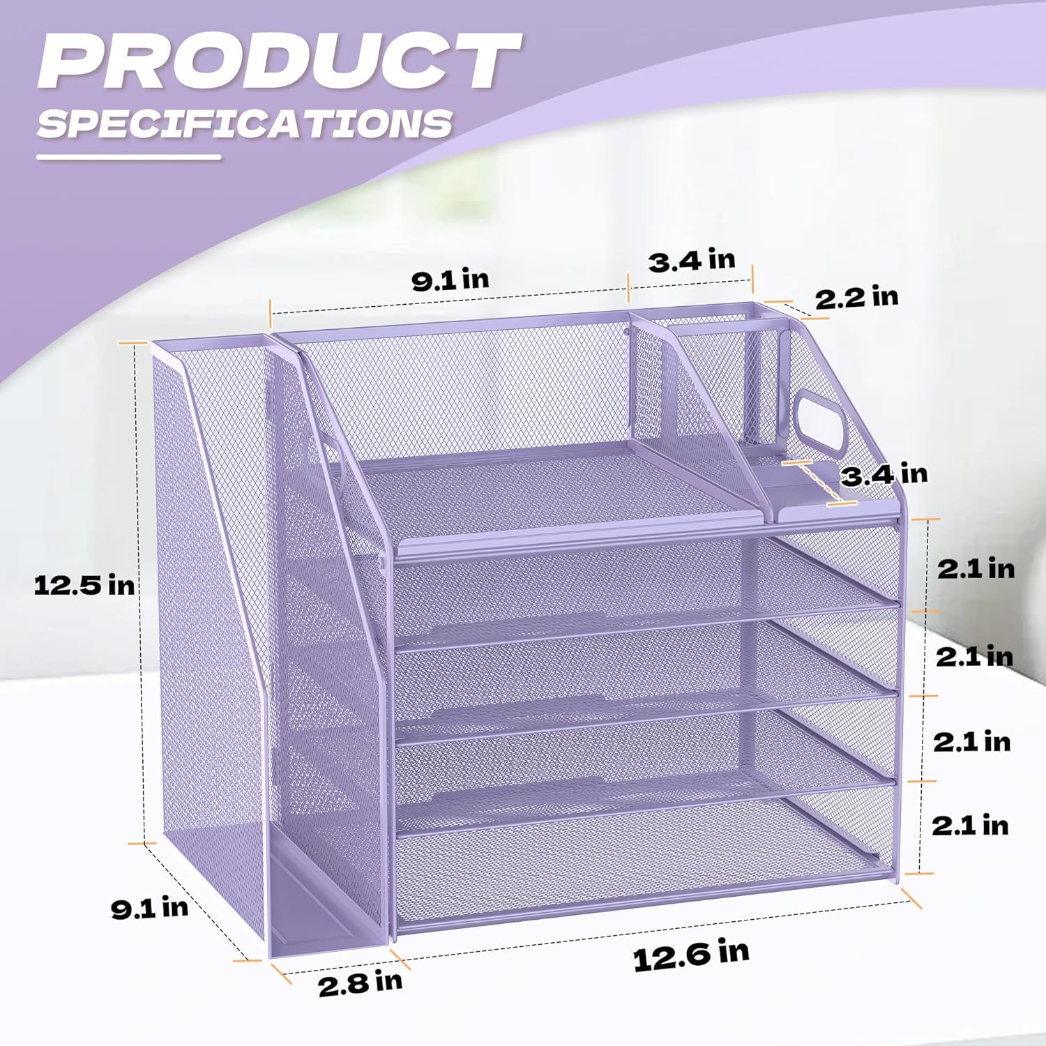 DocNest 5 Tier Paper Letter Tray File Organizer, Mesh Desk File with Handle, Workspace Desk Organizers with Pen Holder, Office Organization Storage Accessories - Purple
