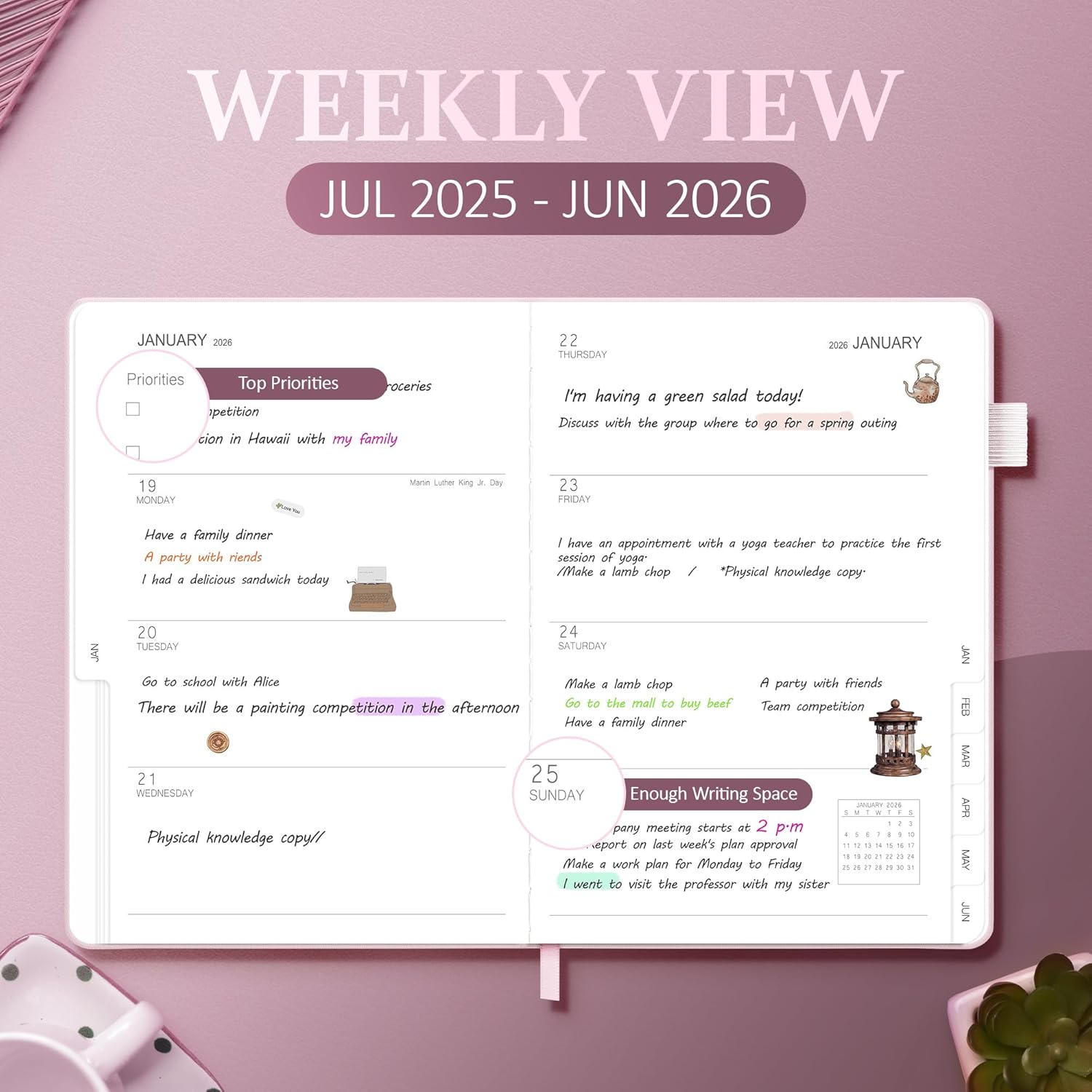 - Academic 2025-2026: Stay organized and productive with the academic 2025-2026 A5 Weekly Planner! Spanning July 2025 to June 2026, this planner offers 12 months of smart scheduling with monthly and weekly layouts, task lists, and goal-setting sections. Perfect for students, professionals, and busy individuals, it helps you manage deadlines, track progress, and reduce stress. The sleek design features ample writing space and stylish accents, making planning both efficient and enjoyable. Take control of your time—wherever life takes you!