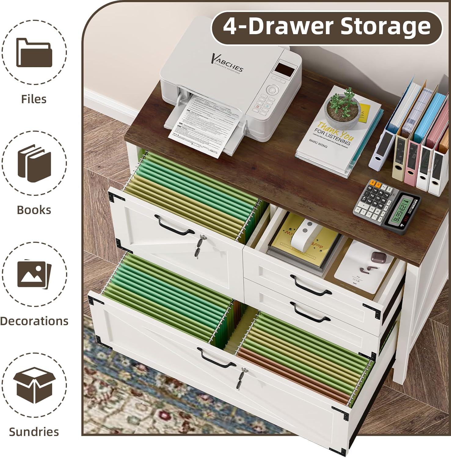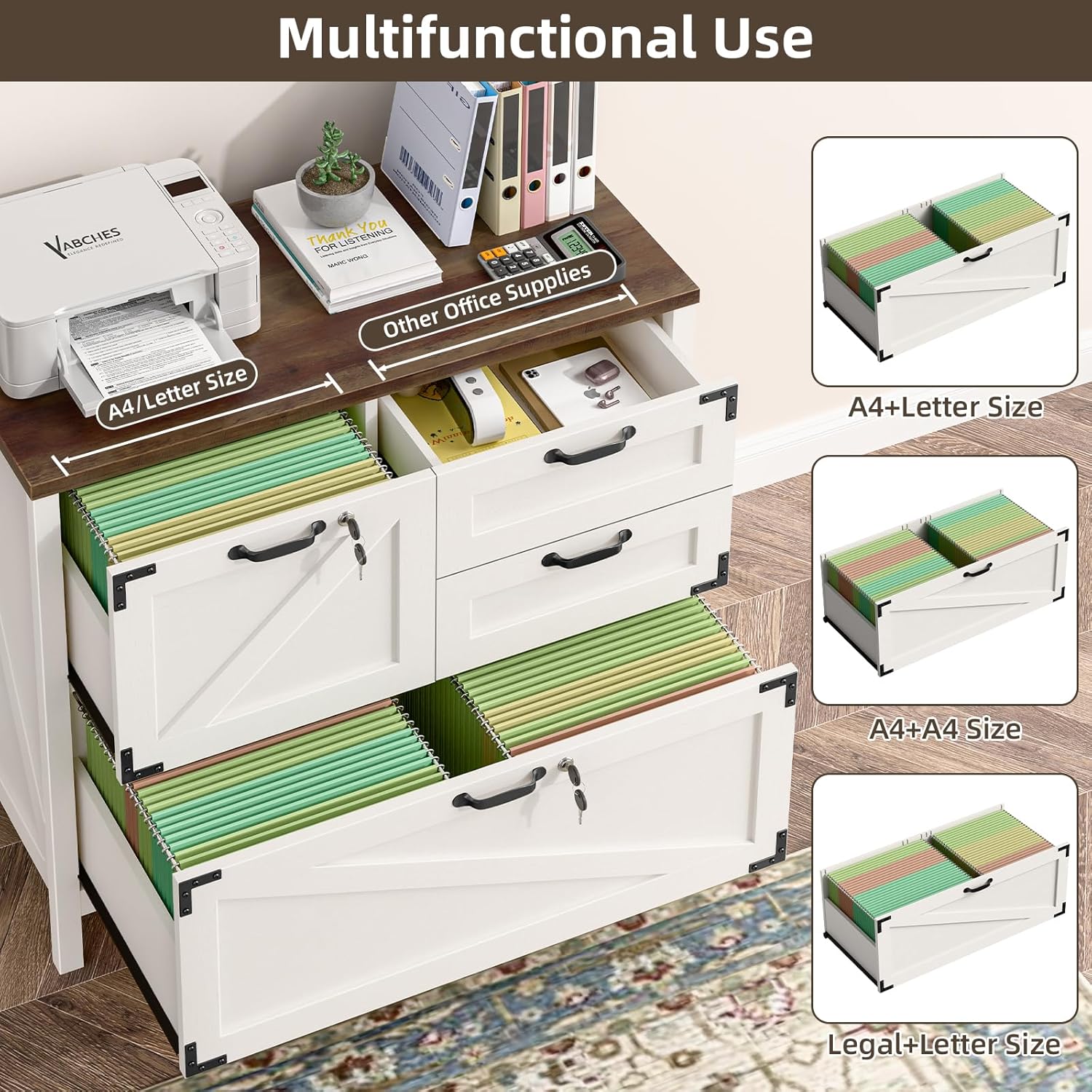 - 🖨️【Multi-functional Storage】This lateral file cabinet can be used not only for hanging files to keep your documents organized. It can also be used as a dresser or large nightstand for household items.The large 31.7"W x 15.75"D desktop is perfect for printers, scanners and more.
