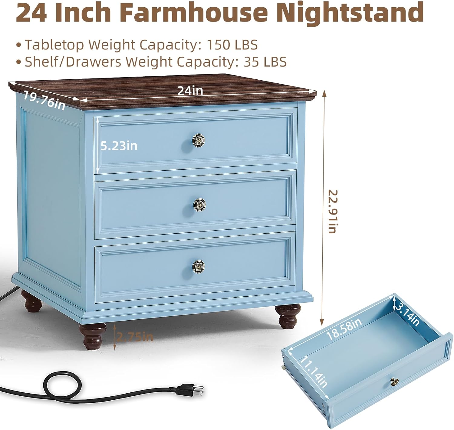 - [Versatile Usage Options]The farmhouse style and spacious large-size design of the 3 drawer nightstand makes it suitable as an end table or a bedroom night stand.Size:19.76"D x 24"W x 22.91"H.