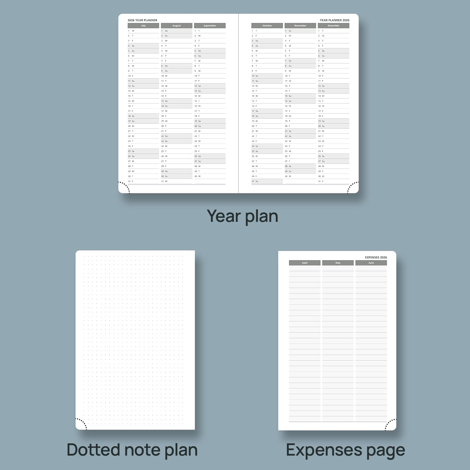 - EXTRA FUNCTION PAGES - Includes a 2026-2027 Yearly Overview, Holiday & Calendar, Monthly Expenses, Contact & Password pages, Birthday & Important Date, and dotted note pages for detailed jotting.