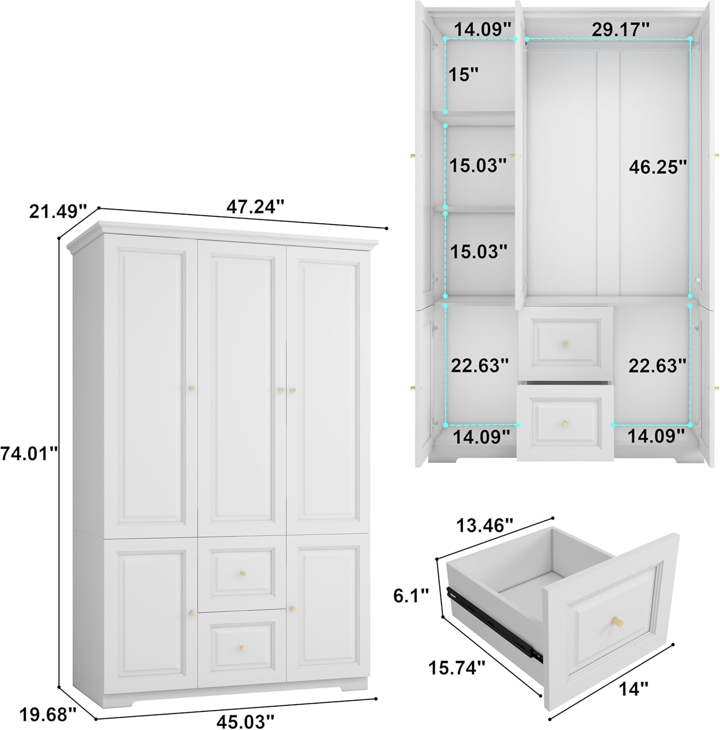 - Perfect Size: The white wardrobe closet with drawers measures W47.24" * D20.51" * H74.01", spacious yet space-efficient, making it especially ideal for medium to small-sized homes. It offers maximum storage capacity within limited space. The closet cabinets with doors and shelves has top space for placing luggage, storage boxes, and other seasonal items, effectively utilizing vertical space. It’s a great helper for expanding storage in the home.