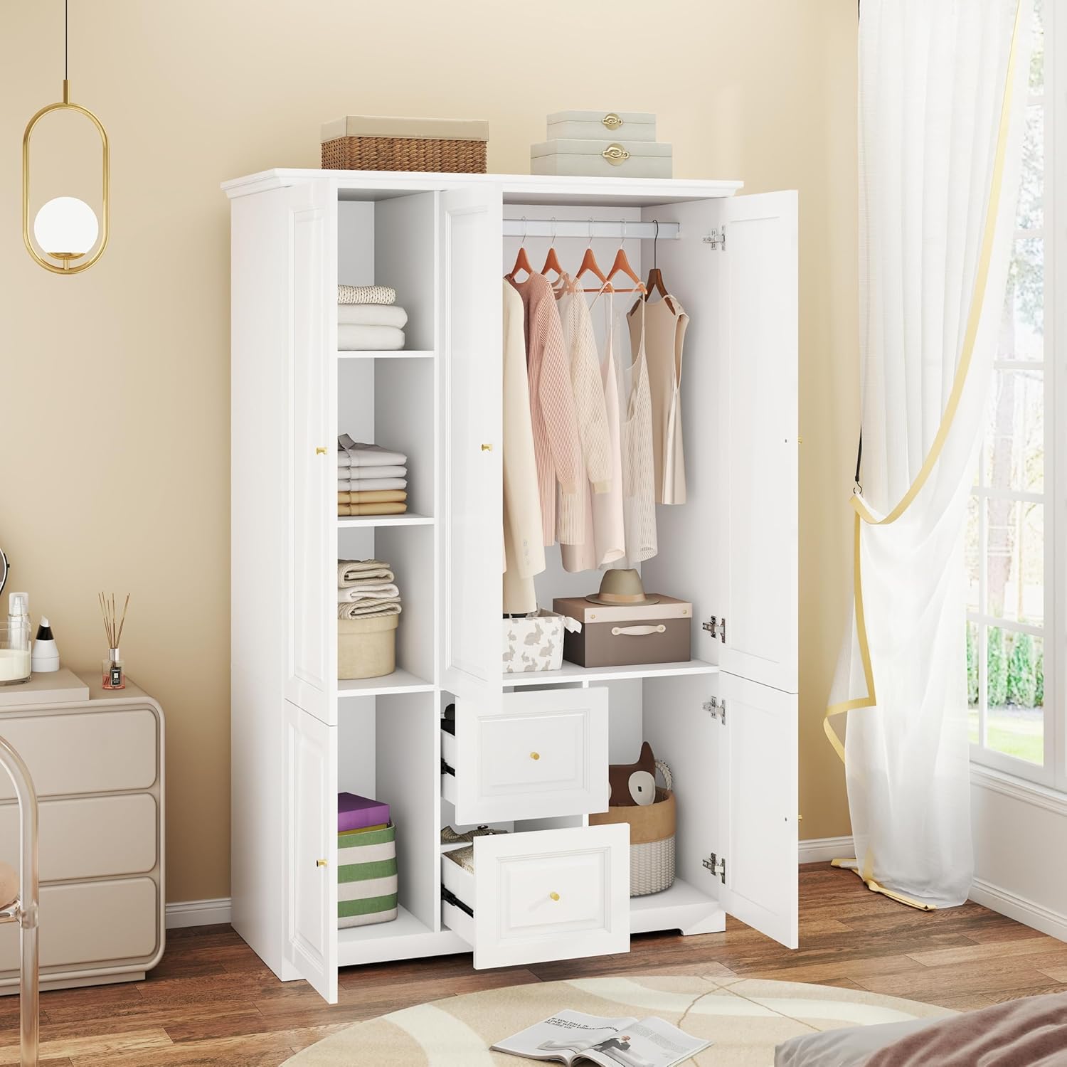 White Armoire Wardrobe Closet with Drawers: Wardrobe Closet for Hanging Clothes, Modern Bedroom Armoires with Hanging Rod, Wardrobes Closets with Doors and Shelves (White, 47")