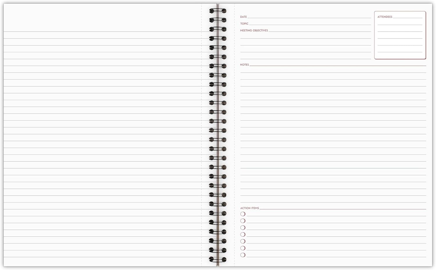 - Top of each page has space for Date, Time, Meeting Objective and Attendees