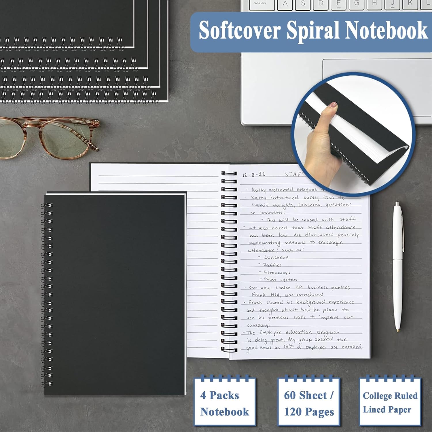 - 【LOW COST & HIGH QUALITY】 4pcs multipack is GOOD COMPROMISE for this A5 wirebound notebooks bulk, they’re great size to keep in a purse or for taking notes, message at school, meetings. Sturdy soft cardstock covers are plain in black, and fun to decorate to doodle on or customize