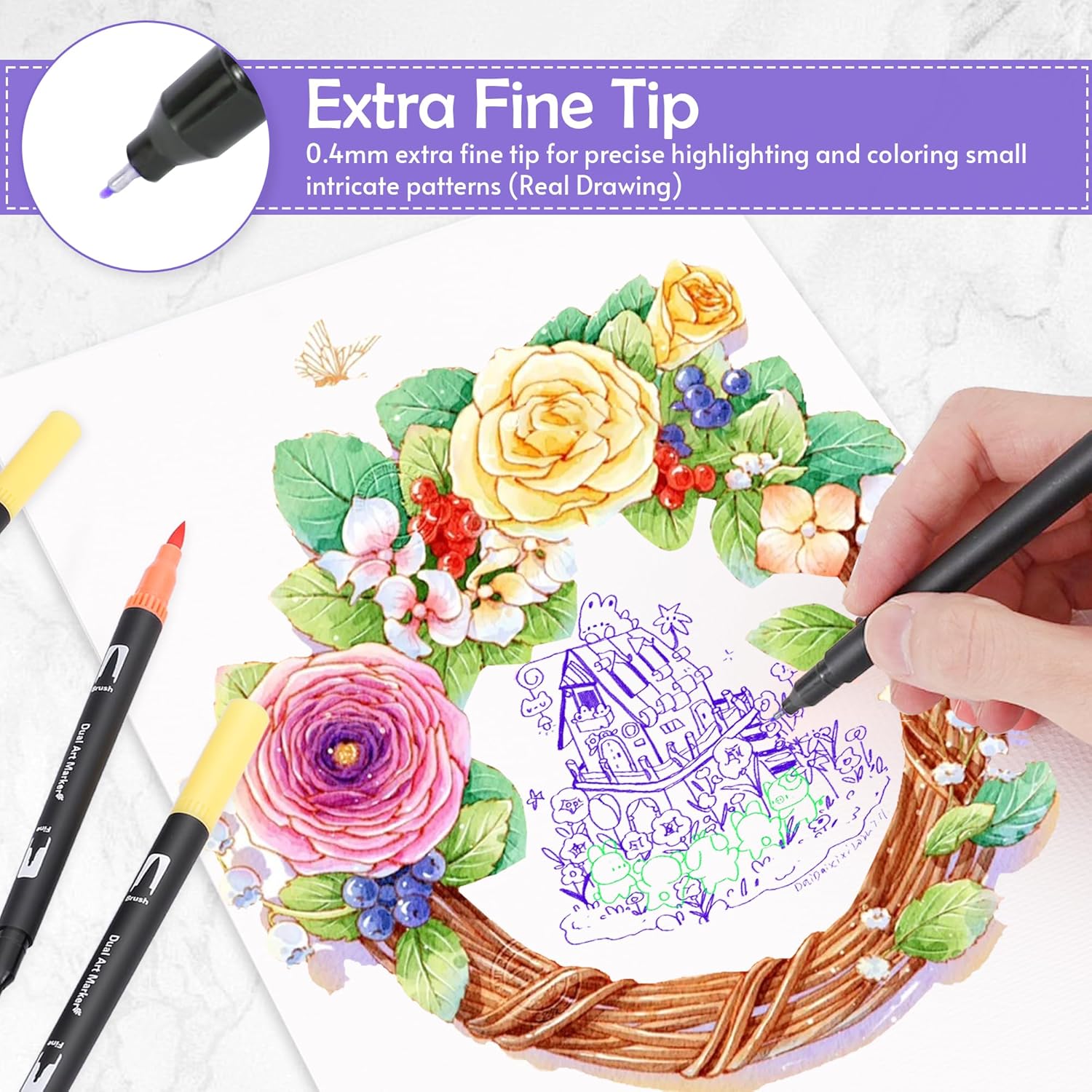 - 🎨 Convenient Dual Tip Paint Markers: Each watercolor marker features two different tips to meet different coloring needs, eliminating the hassle of switching nibs and offering greater convenience for your creations. The 0.4mm fine tip is perfect for sketching outlines and adding details, while the 1-2mm soft brush tip is ideal for shading and quickly coloring large areas in your art projects. Whether you're a beginner or a professional, you can fully unleash your creativity!