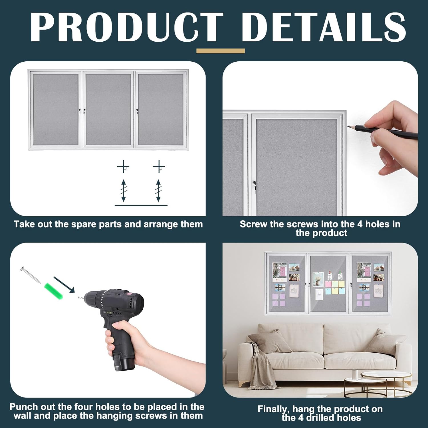 - Package Includes: you will receive a lockable cork bulletin board with 3 doors and aluminum frame, comes with 6 keys and screw accessories, the included bulletin board measures about 72 x 36 inch, can hold about 18 A4 sheets, can display more information