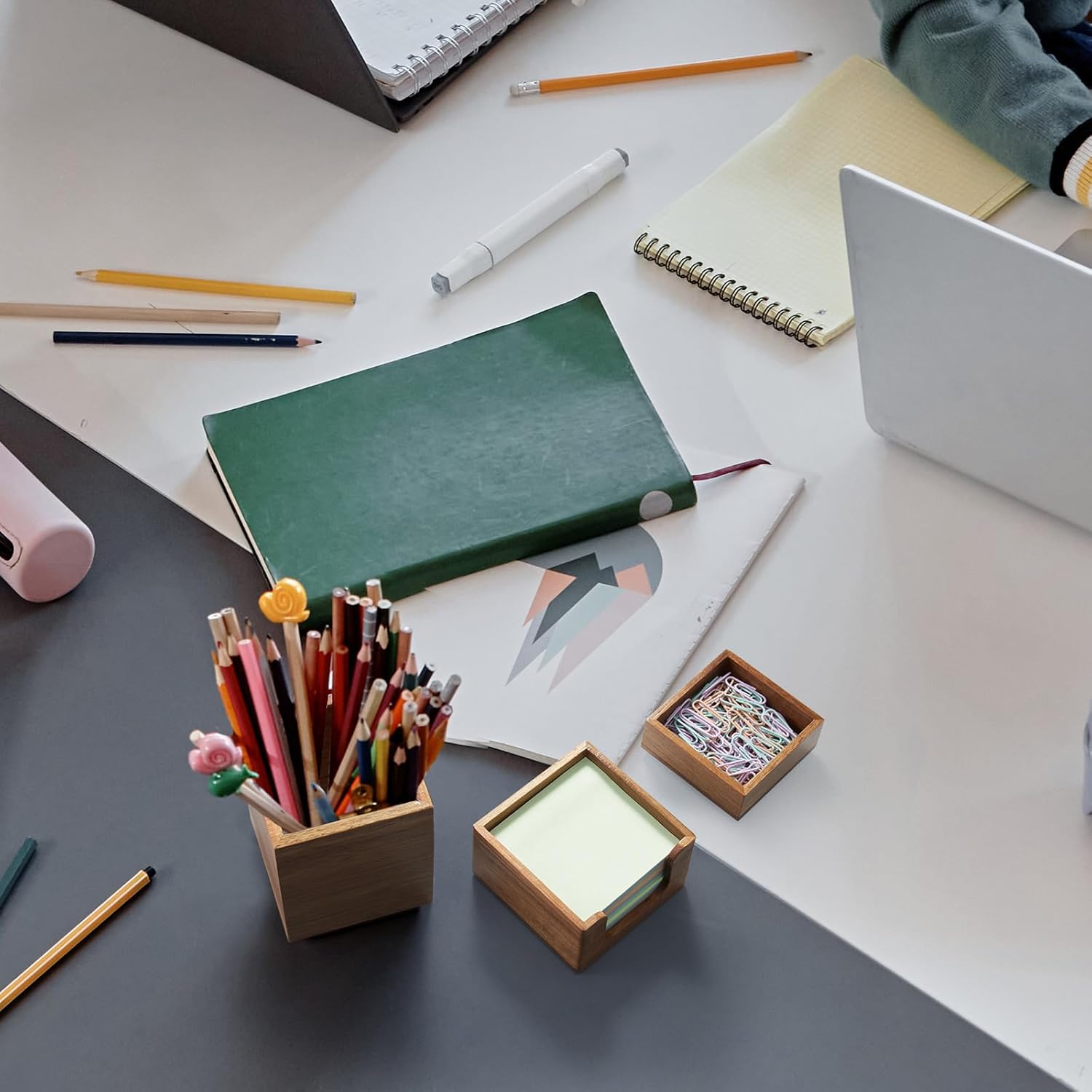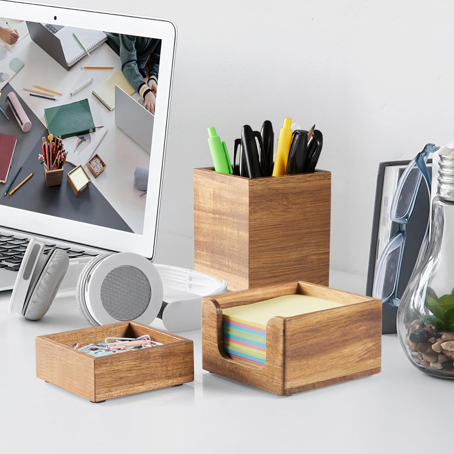 Desk Organizer Set of 3 - Acacia Wood Office Desk Accessories - Desk Organizers and Accessories for Women Men - Set incl. Pencil Pen Holder, Paperclip Storage and Sticky Note Holder
