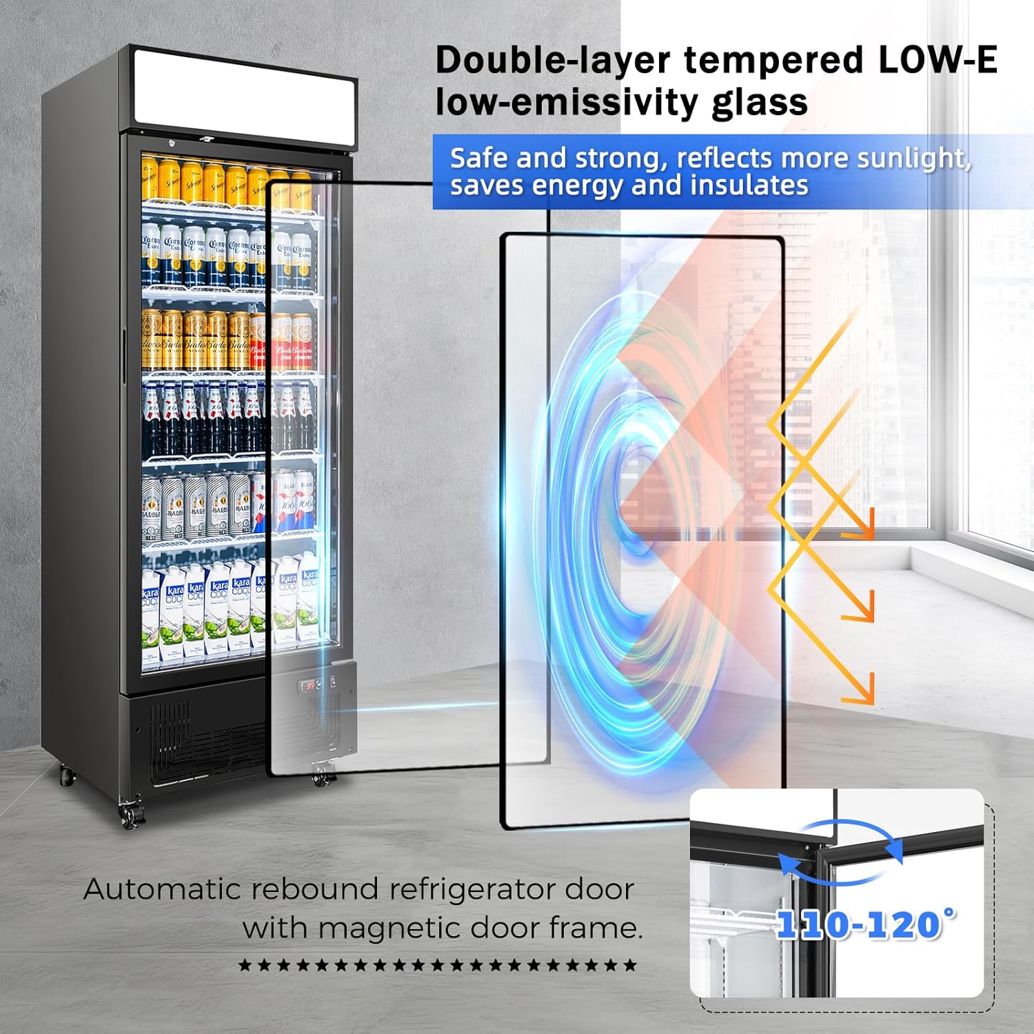 - Premium Features: Our commercial beverage fridges feature durable double-layer tempered LOW-E glass doors that block sunlight while maintaining temperature. Drink fridge details include: energy-saving LED interior lighting, digital temperature display, security lock, magnetic door seal and customizable branded light box