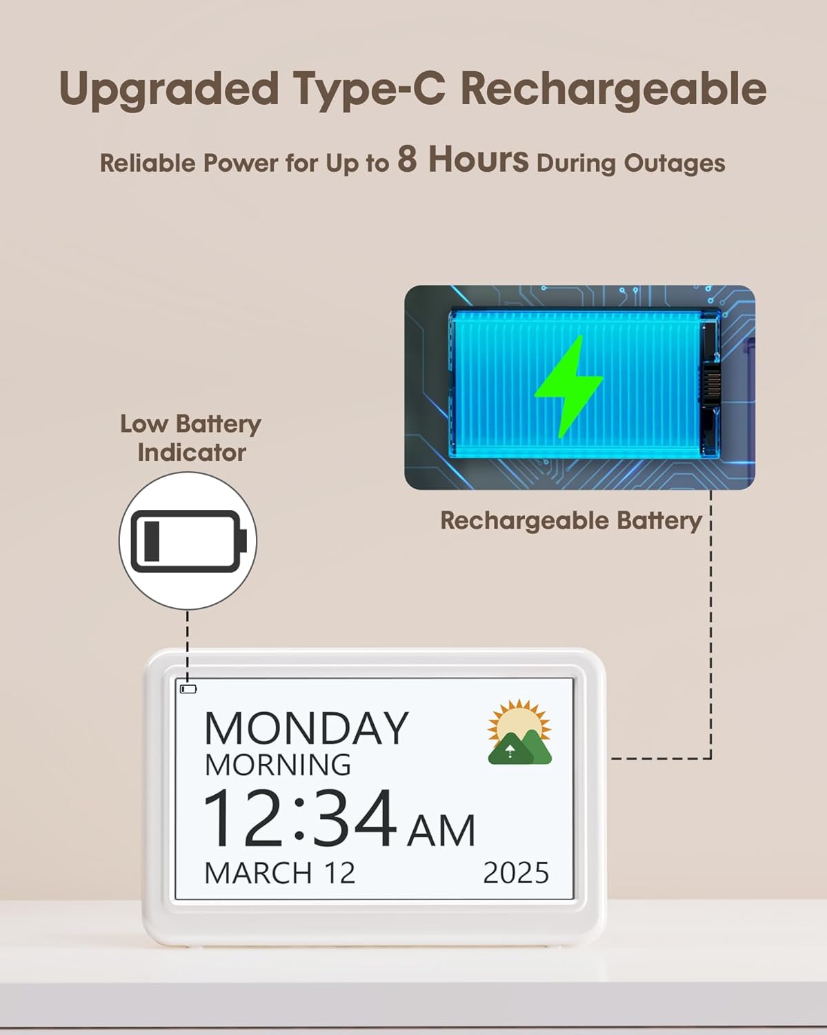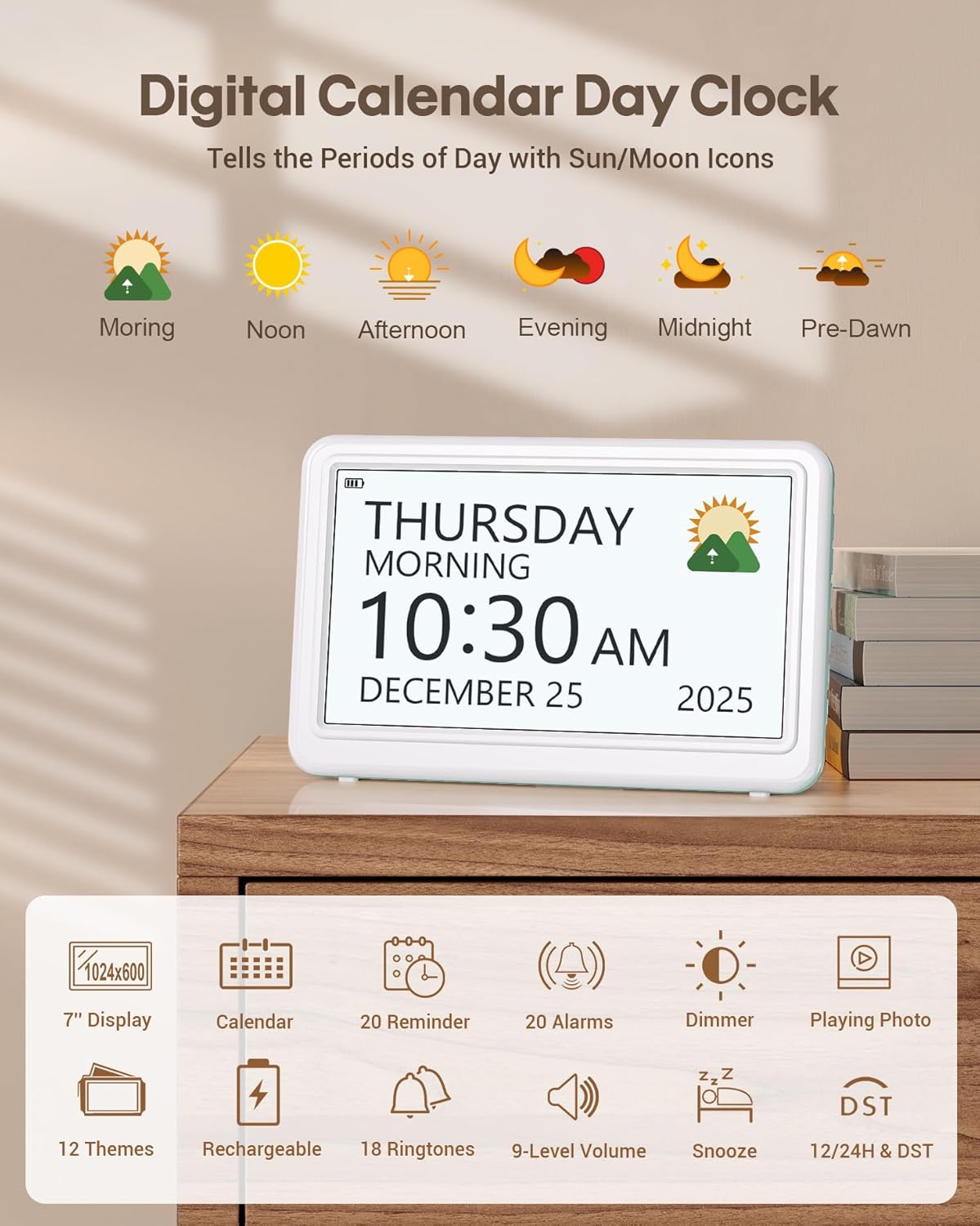 - ใHD Display & Larg FontใThe ๐ฐ๐น๐ผ๐ฐ๐ธ ๐๐ถ๐๐ต ๐ฑ๐ฎ๐๐ฒ ๐ฎ๐ป๐ฑ ๐๐ถ๐บ๐ฒ ๐ณ๐ผ๐ฟ ๐ฒ๐น๐ฑ๐ฒ๐ฟ๐น๐ features a 7-inch 1024x600P HD LCD display that clearly displays the TIME, DATE, DAY of the WEEK, six time periods of the day[ MORNING, NOON, AFTERNOON, EVENING, NIGHT, MIDNIGHT, BEFORE DAWN ], and displays the ICONS of each time period in a bright Sun๐ Moon๐ visuals, ensuring that elderly individuals can easily understand the time and date.