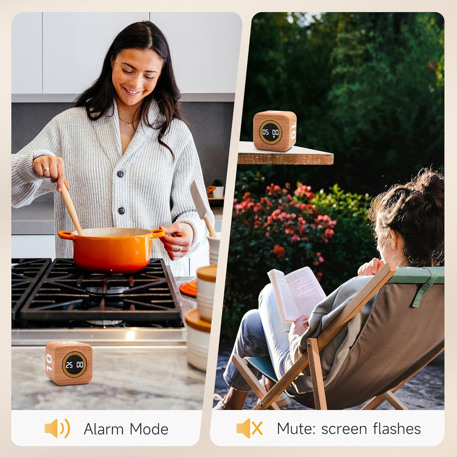 Rotating Productivity Timer 5, 25, 10, 50 Minutes Preset, Desk Cube w/Gravity Sensor for ADHD, Mute Functions, Ideal for Work, Study, Kitchen, Back to School (1, Wood Grain Finish)
