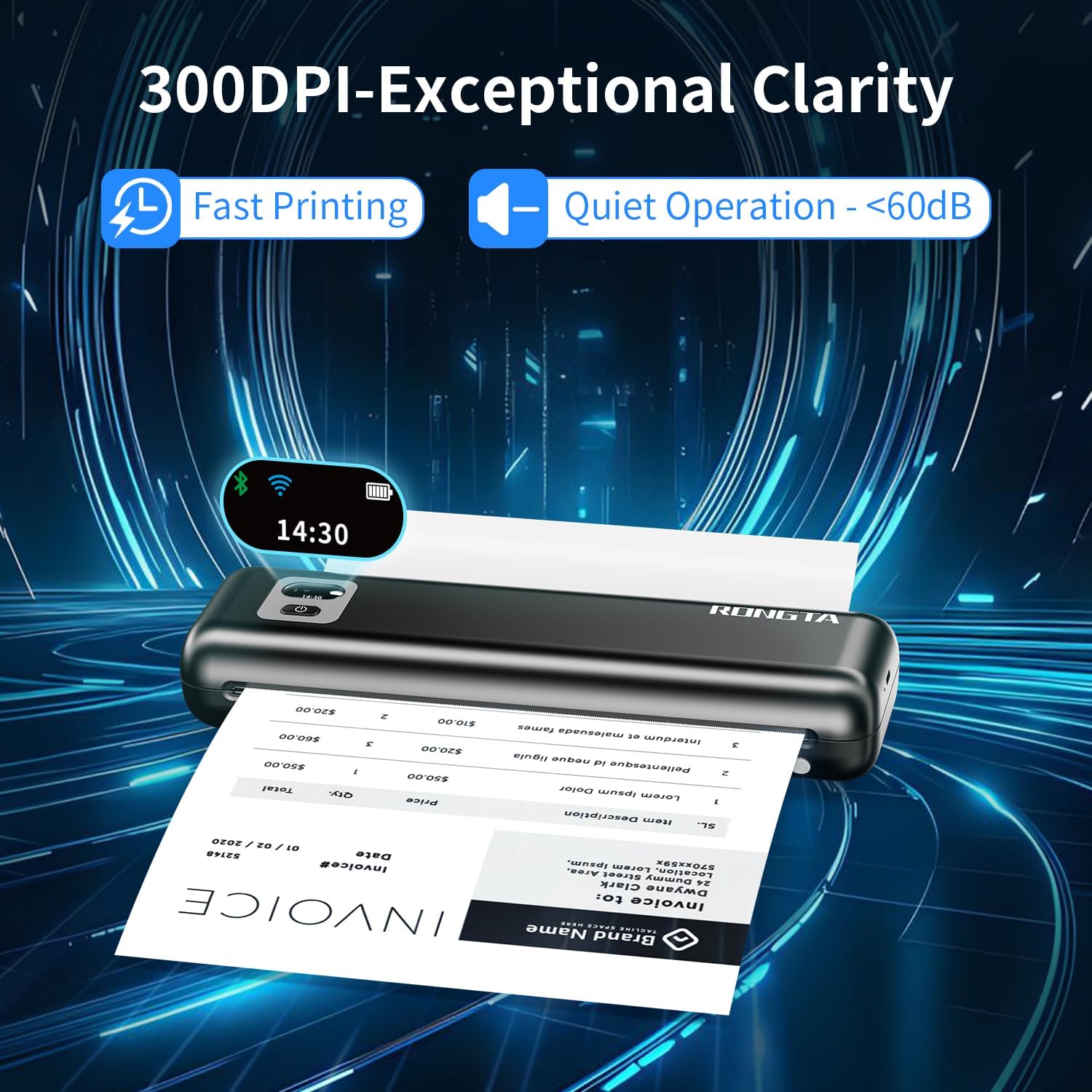 - High Quality Print: RONGTA portable printer, 300DPI resolution, large to 8.5" paper warehouse design, easy to use and maintain. It meassured 10.9x3.8x2.1inches, with weight only 0.99lb(450g).Print recipes, forms, letters, assignments, study materials, and travel documents hassle-free with advanced thermal technology. Meanwhile,with noise levels under 60dB, this mini thermal printer operates quietly, ideal for printing in quiet spaces like libraries, meeting office, or at home.
