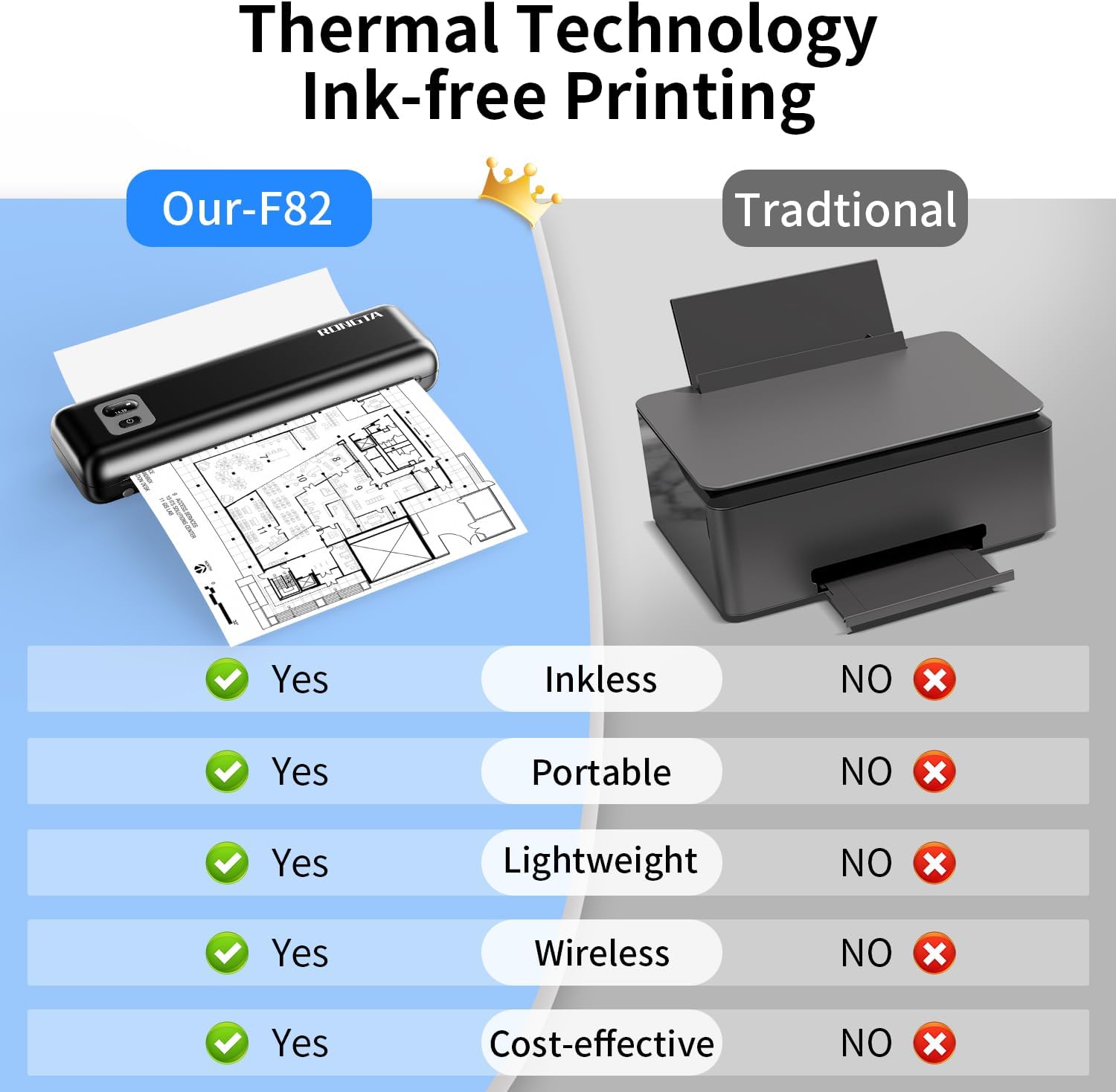 - Mobile Thermal Printer: Bluetooth and wireless printers for iphone, can be used with bluetooth smart devices of Android &iOS,portable thermal printer 8.5 x 11 inches, printing ranging from 4 to 8.5 inches ,including US Letter legal, A4 thermal papers or 4inch thermal papers roll.Do not require a ribbon or ink cartridge, portable thermal printer, small printers easy for home use, low operating cost.