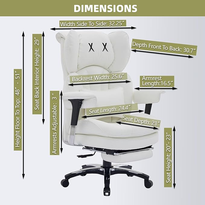- Ergonomic White Office Chair for Stylish Comfort This white office chair combines fashion and function, designed to support your spine and reduce fatigue during long hours. The high-back office chair includes a plush headrest and padded lumbar pillow for enhanced comfort. Its extra-wide seat makes this big and tall office chair perfect for working, studying, or gaming. Ideal as a computer chair, gaming chair, or executive office chair.