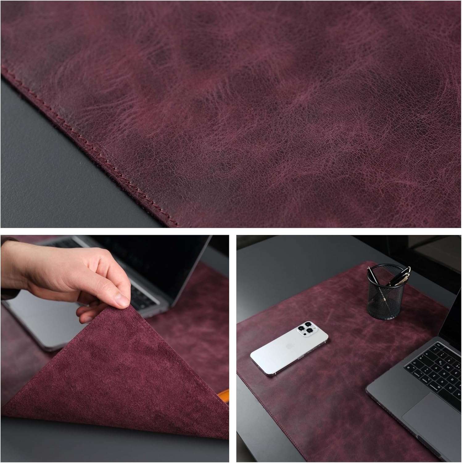 Jersey Genuine Calfskin Leather Desk Pad, Office Desk Mat with Non-Slip Bottom, Smooth Surface for Mouse & Keyboard, Desk Protector (36x19 inches) (Dark Purple)