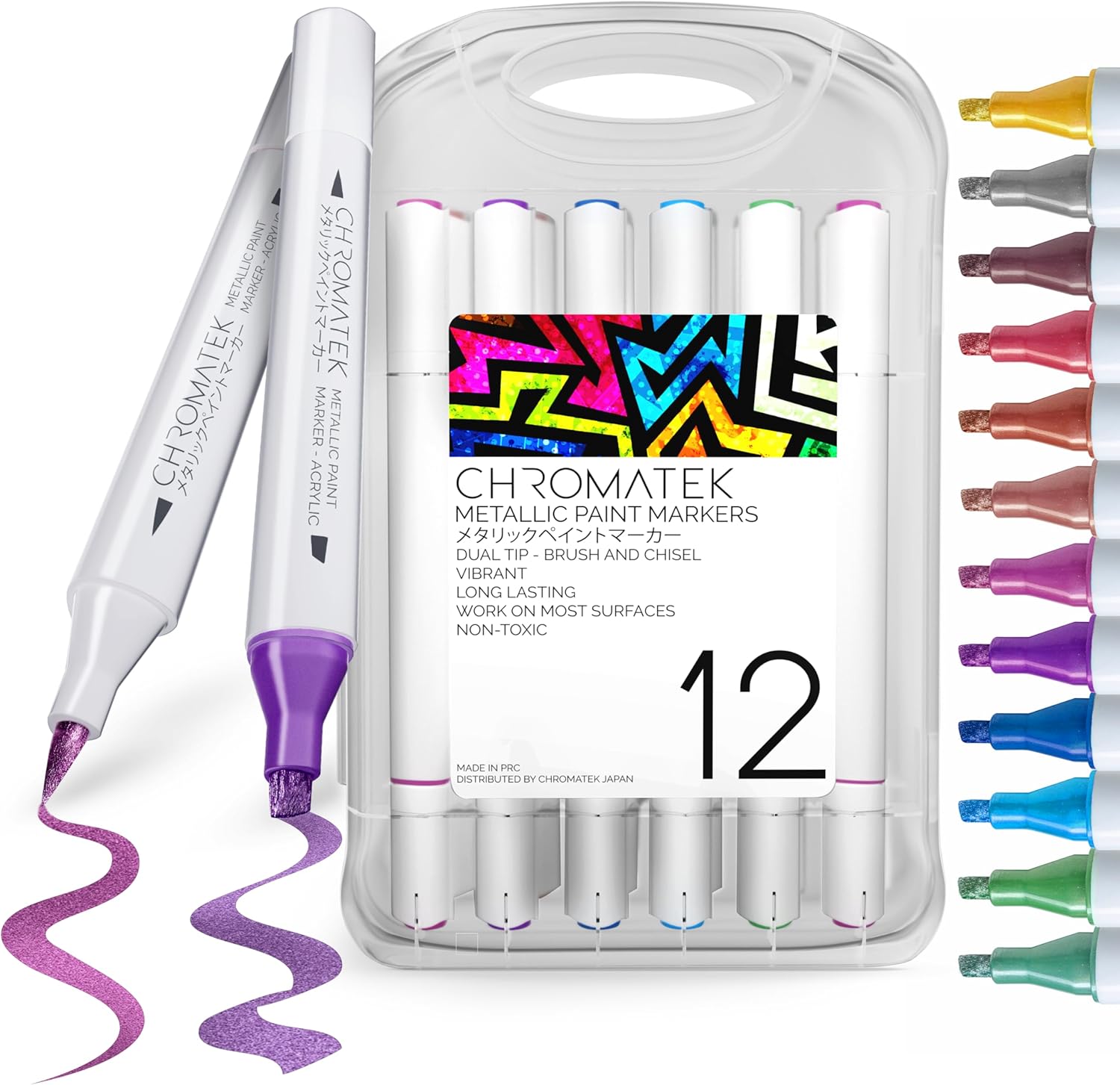 CHROMATEK Dual Tip Metallic Paint Markers - 12 Colors Brush & Chisel Tip Paint Pens for Black Paper, Rock Painting, Scrapbooking, Card Making, Photo Album, Glass, DIY Crafts Art Supplies, Waterproof