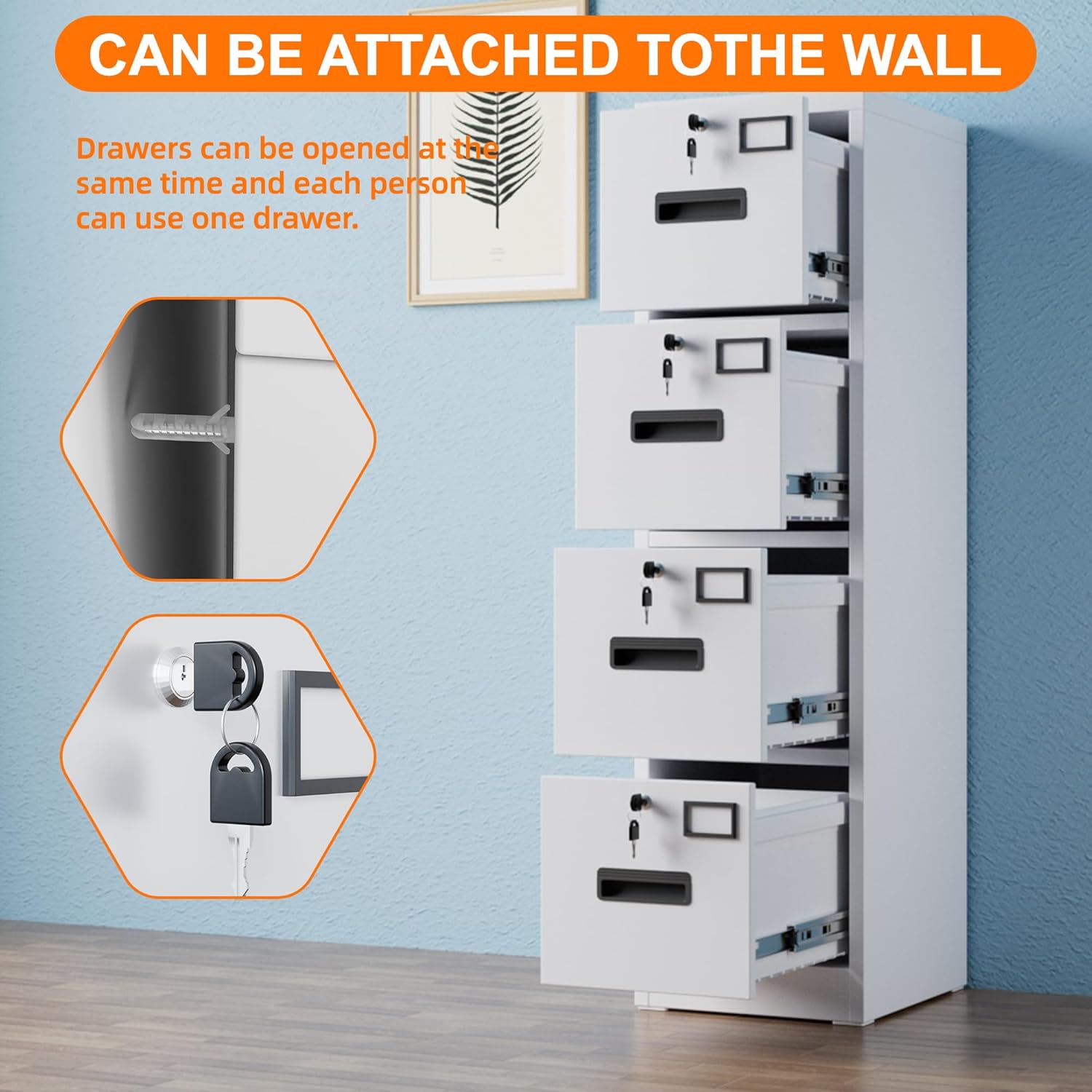 4 Drawer File Cabinet with 4 Independent Locks, Metal Vertical Filing Storage Cabinet for Home Office with Card Holder for Letter/Legal/A4 Folders, Assembly Required, 4 Drawers, White