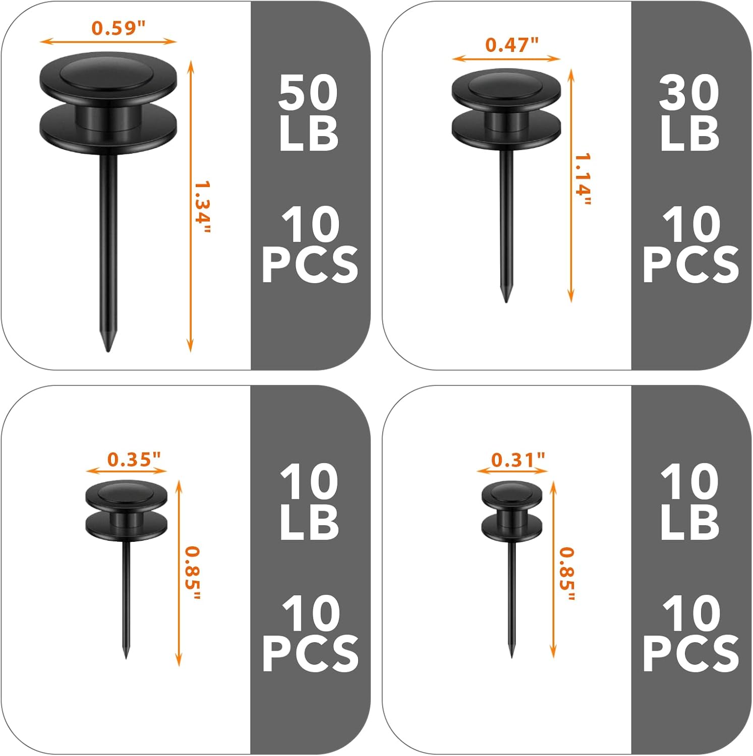 40 PCS Picture Hangers Nails 4 Size Long Heavy Duty Thumb Tacks for Wall Double Headed Push Pins Picture Hooks, Renter Friendly Decor Thumbtacks for Tapestry Frame Art Photos,10/20/ 30/ 50lb(Black)