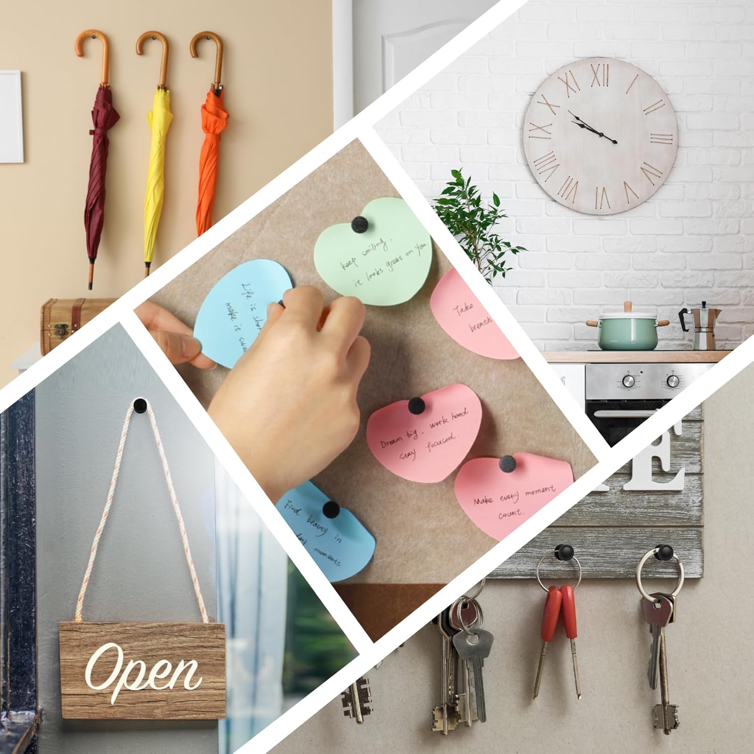 - TRACELESS THUMBTACKS: The holes made by the Hang pictures on wall without nails are very small and almost leave no marks, which can avoid damaging the walls. The picture hangers enable you to create beautiful displays without leaving a lasting impact. Please consider the hardness of the wall before purchasing. Our wall hooks for hanging may not be suitable for very hard or fragile materials, so be sure to evaluate the wall type in your home for the best results.