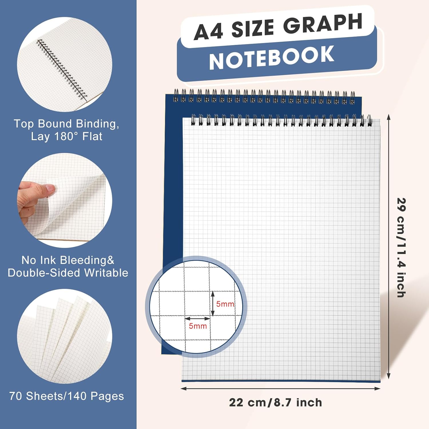 - Top Bound Design: the A4 grid notepads are designed with twin wire binding on the top, so the notebook can lay 180° flat on the table for writing and can 360° rotate, easy to flip, making writing more convenient for both left handed and right handed users