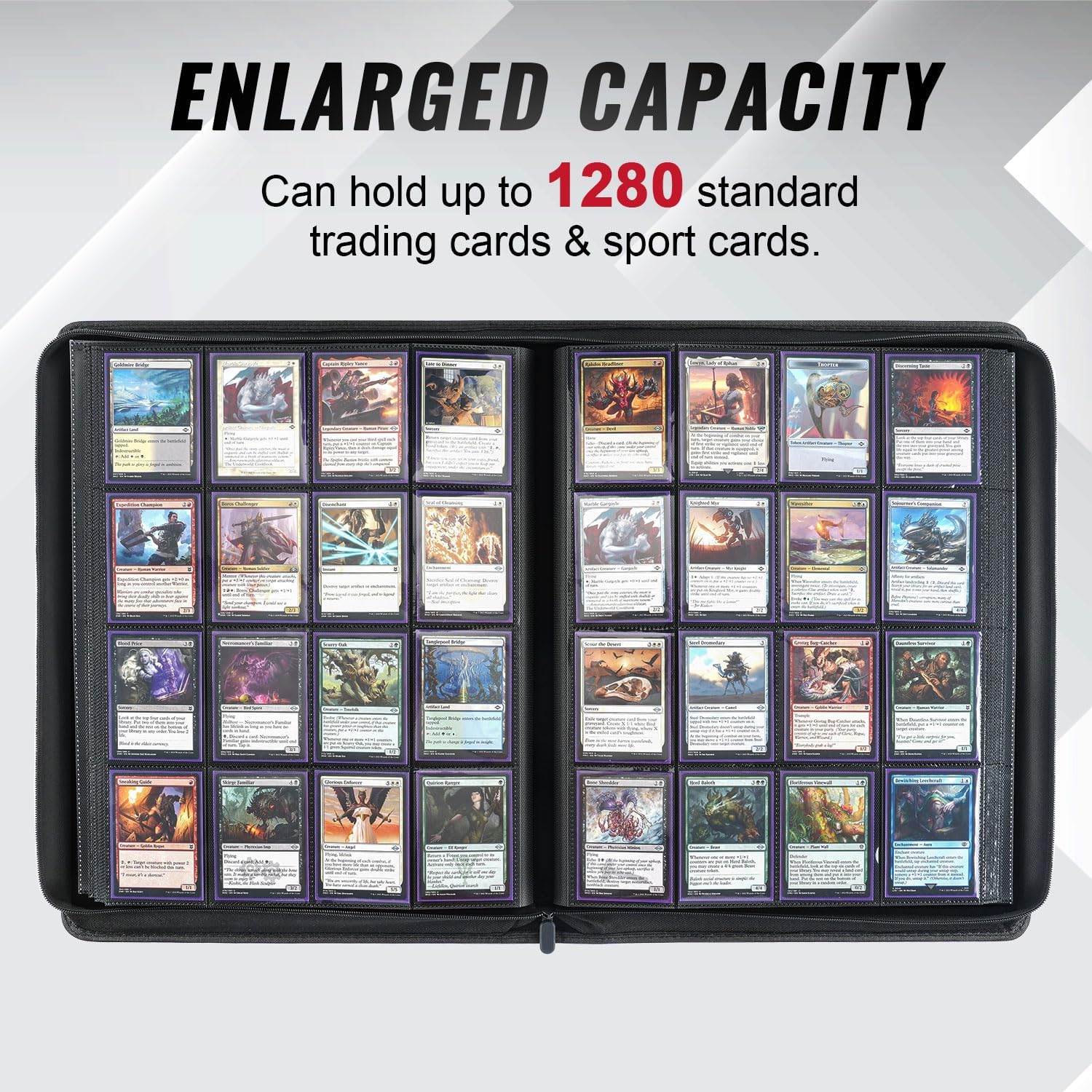 - Spacious 1280-Card Capacity - Designed with 40 double-sided pocket pages, the binder can hold up to 1280 standard trading cards or sport cards. This album securely stores and organizes your entire collection in one place, keeping your cards safe and neatly arranged.