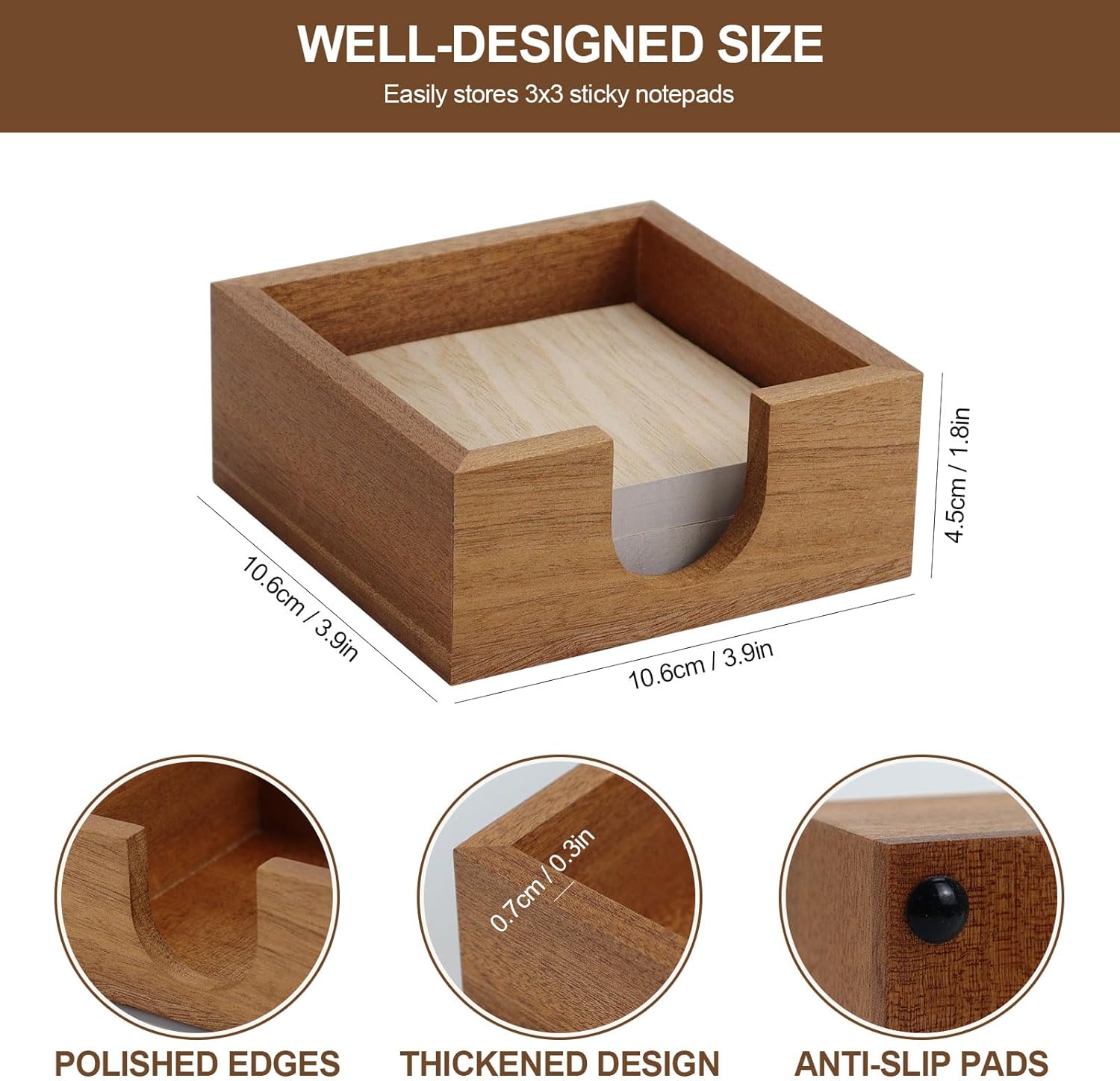 - Material: The post it organizer is made of sapelli wooden refined, tronger and more durable than other common woods, pine, bamboo or pressboard. No sharp edge, made well, Small and compact, no thrills sticky note holder, easy to clean, just gently wipe with a damp cloth