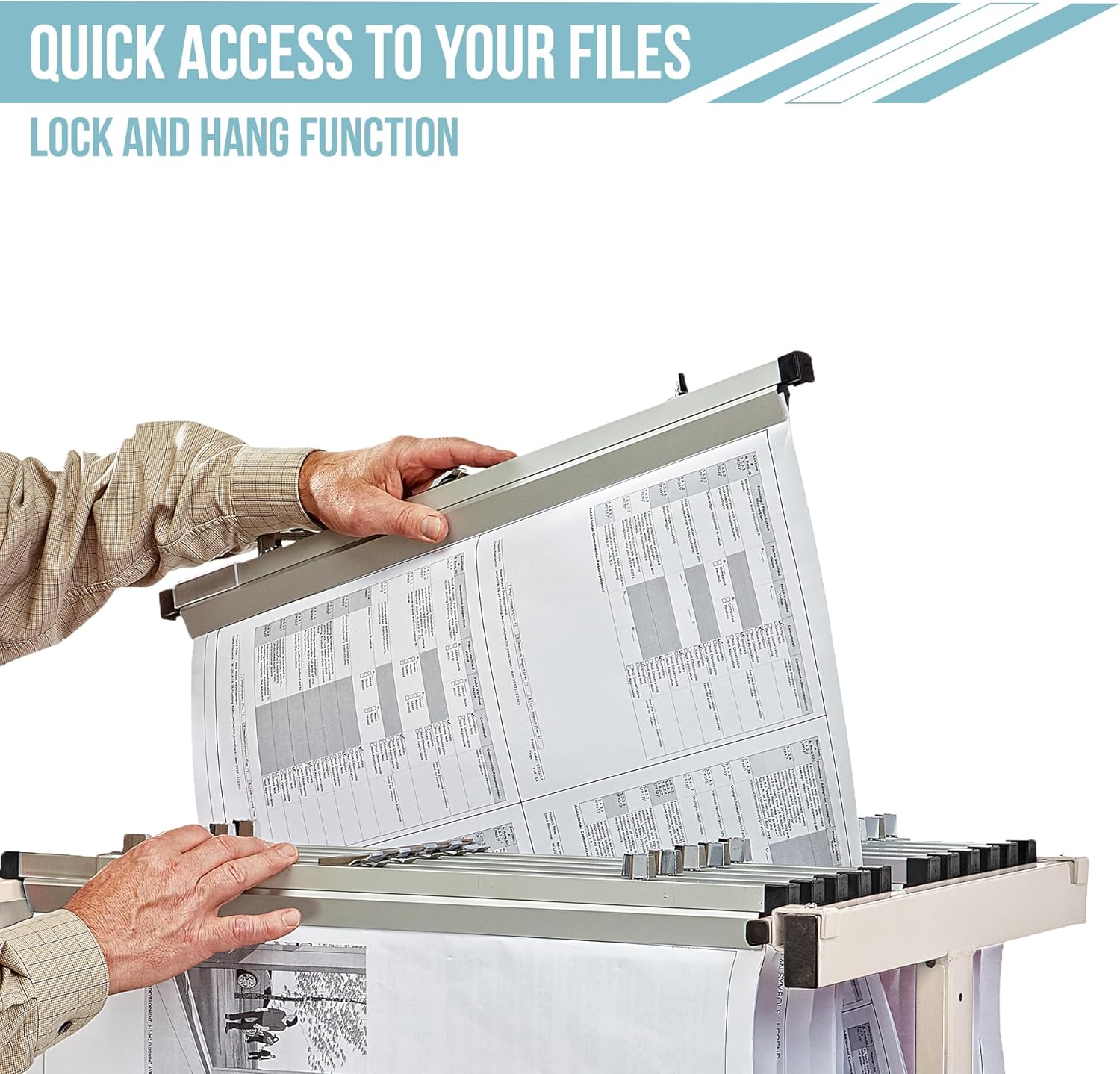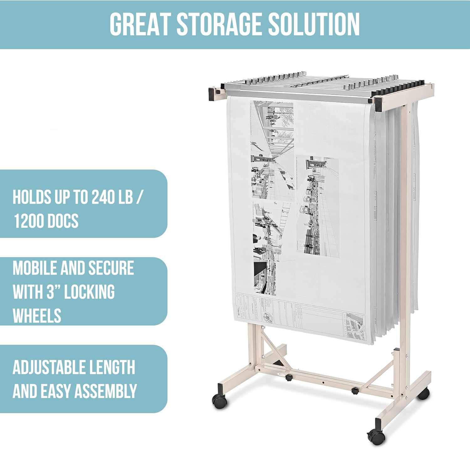 - Mobile and Adjustable Rack: The blueprint rack rolls smoothly on four casters, with front brakes for stability. Height and depth adjustments accommodate different file sizes, making it versatile for various office or job site needs.