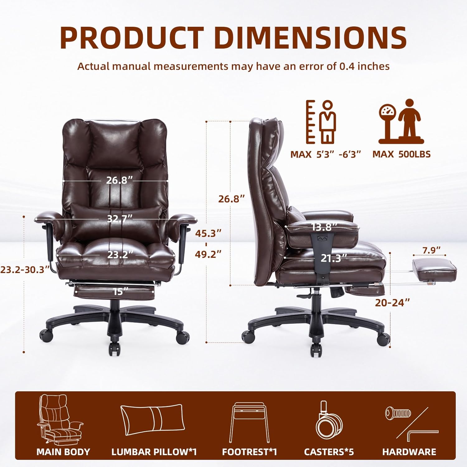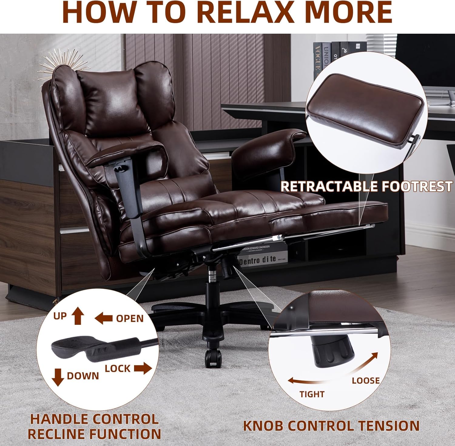 Big and Tall Office Chair 500lbs Wide Seat Executive Office Desk Chair High-Back Office Task Chair with Foot Rest, Ergonomic Lumbar Support Computer Office Chairs for Heavy People(Brown)