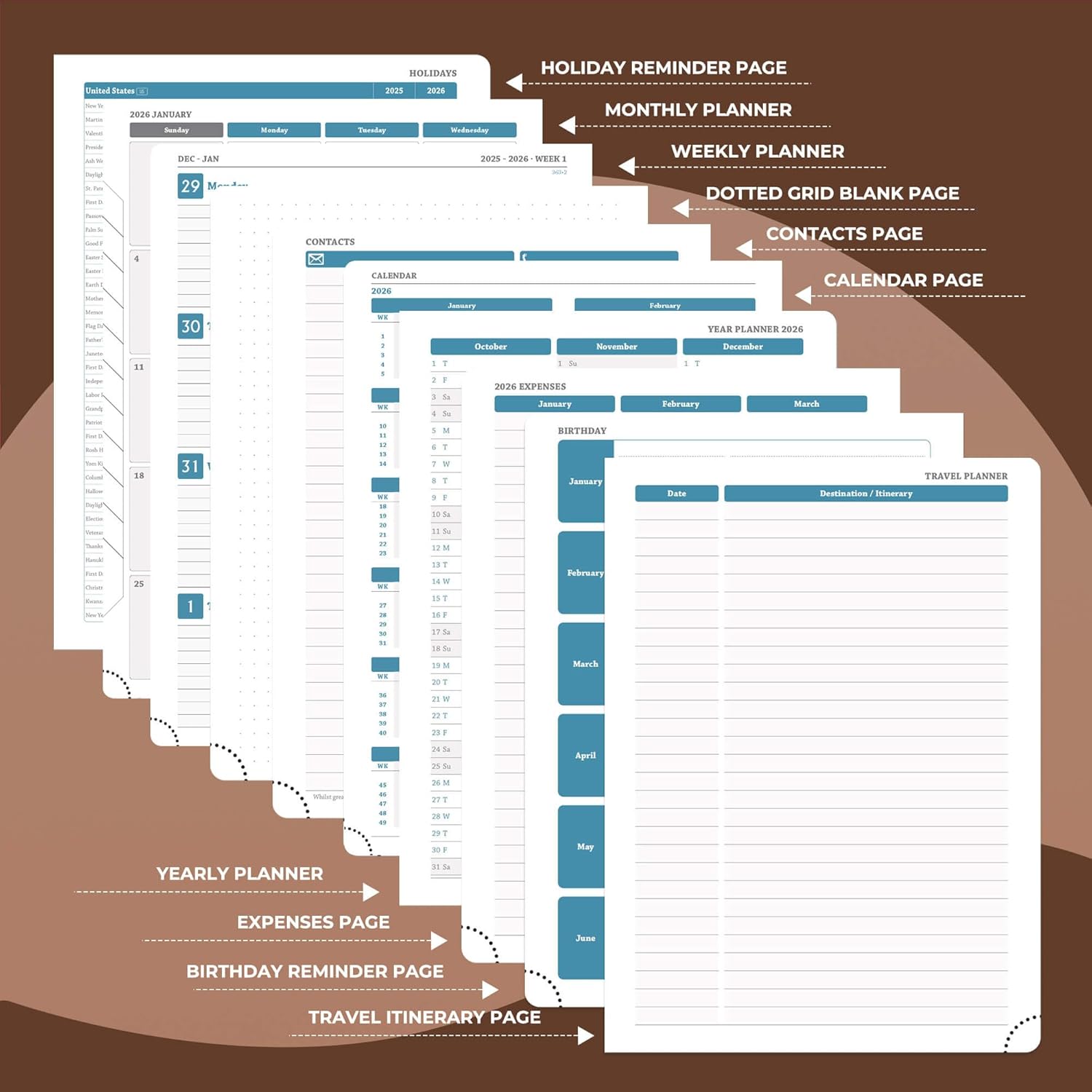 - Universal Design Planner: Suitable for a variety of people and scenarios. Professionals manage project progress, meeting arrangements and goals; student planner 2026 courses, exams and extracurricular activities; home users arrange travel, activitie