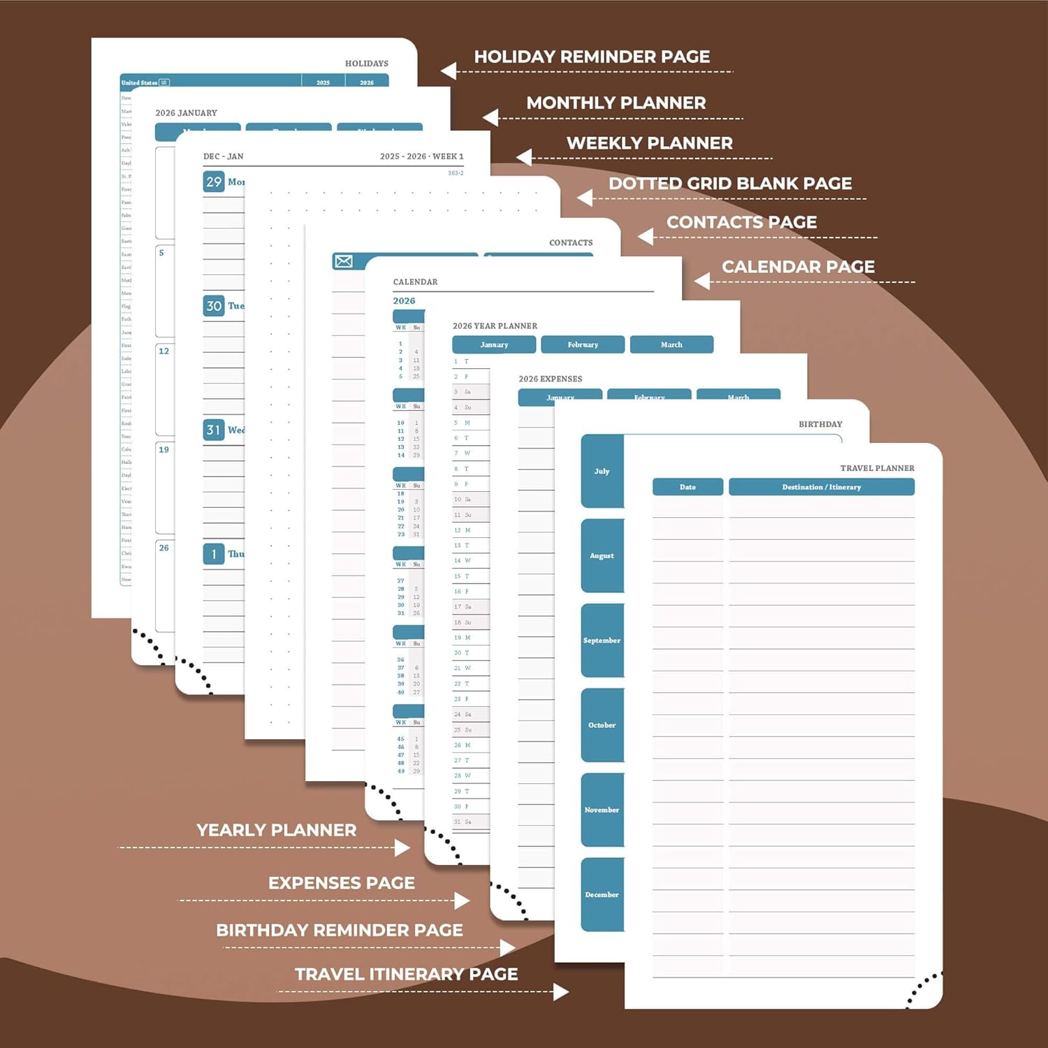 - Universal Design Planner: Suitable for a variety of people and scenarios. Professionals manage project progress, meeting arrangements and goals; student planner 2026 courses, exams and extracurricular activities; home users arrange travel, activitie