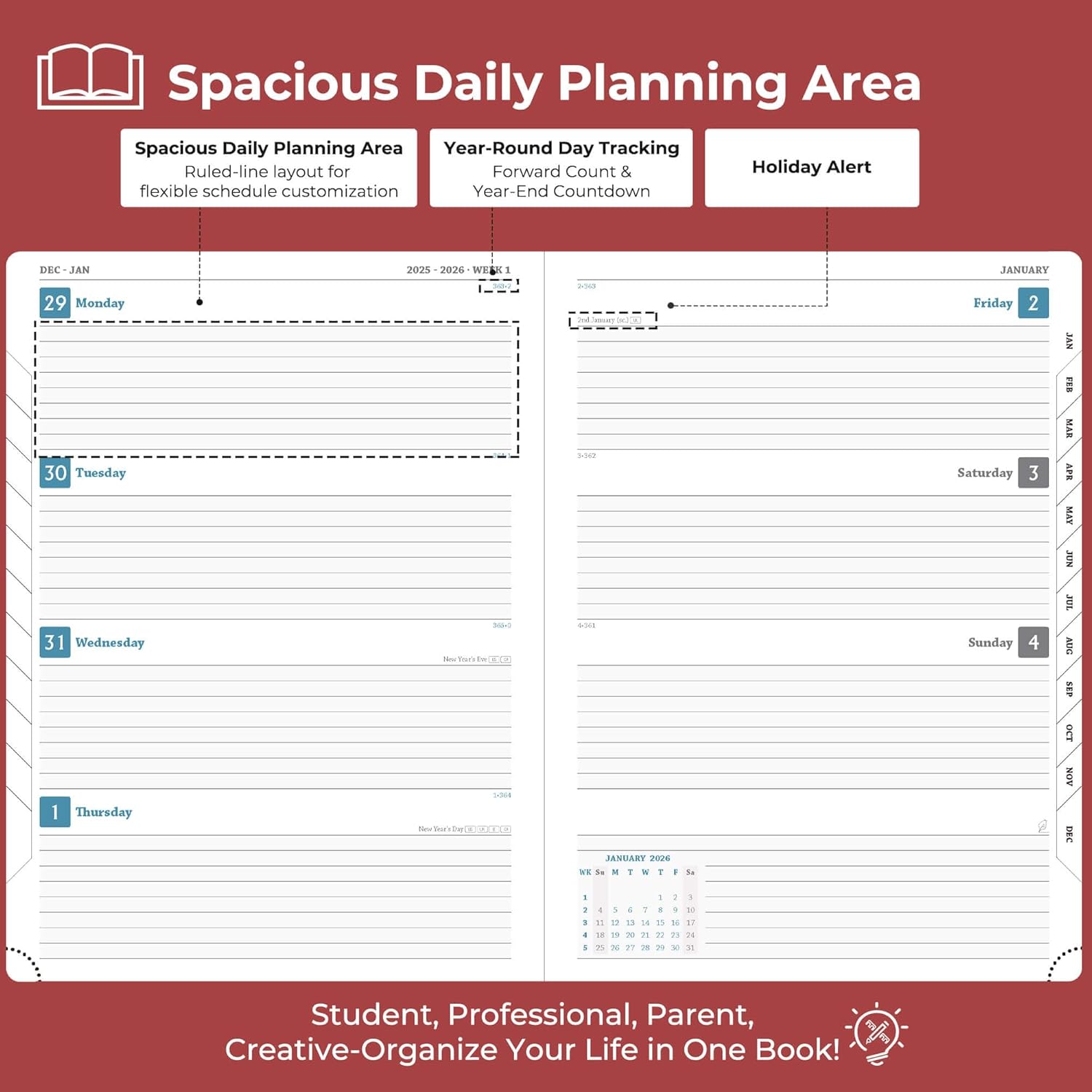 - Universal Design Planner: Suitable for a variety of people and scenarios. Professionals manage project progress, meeting arrangements and goals; student planner 2026 courses, exams and extracurricular activities; home users arrange travel, activitie