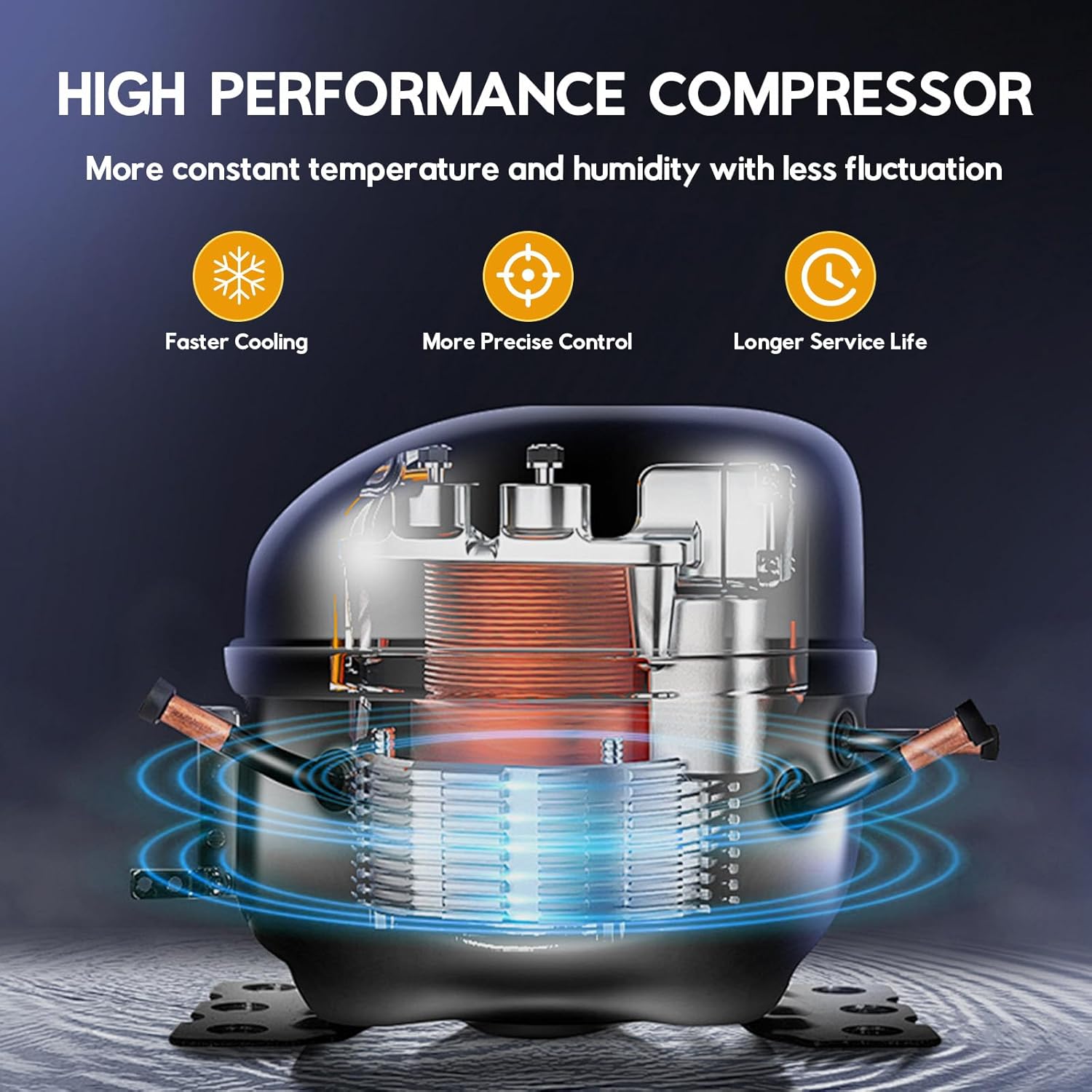- ăSilent Compressor Cooling& 546 Cigar CapacityăUsing silent compressor refrigeration technology, compared with semiconductor refrigeration, the compressor service life is increased by 30%, refrigeration speed is increased by 40%, temperature and humidity fluctuation â¤1, noise ⤠35dB, no vibration, so you can enjoy life without worry. Front air outlet and 4 adjustable non-slip feet, which can be built-in or under-counter. The electric humidors for cigars have a capacity of up to 88L and can hold up to 546 cigars (depending on ring gauge). It is equipped with a safety lock to ensure the security of your precious collection.