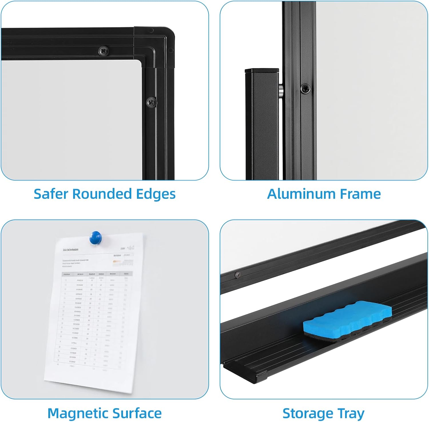 - High-quality materials, sturdy and durable: Dry erase board adopts a metal frame structure and ABS reinforced corners. The surface is also covered with rust-proof black coating. Also equipped with a removable slot for easy storage of accessories