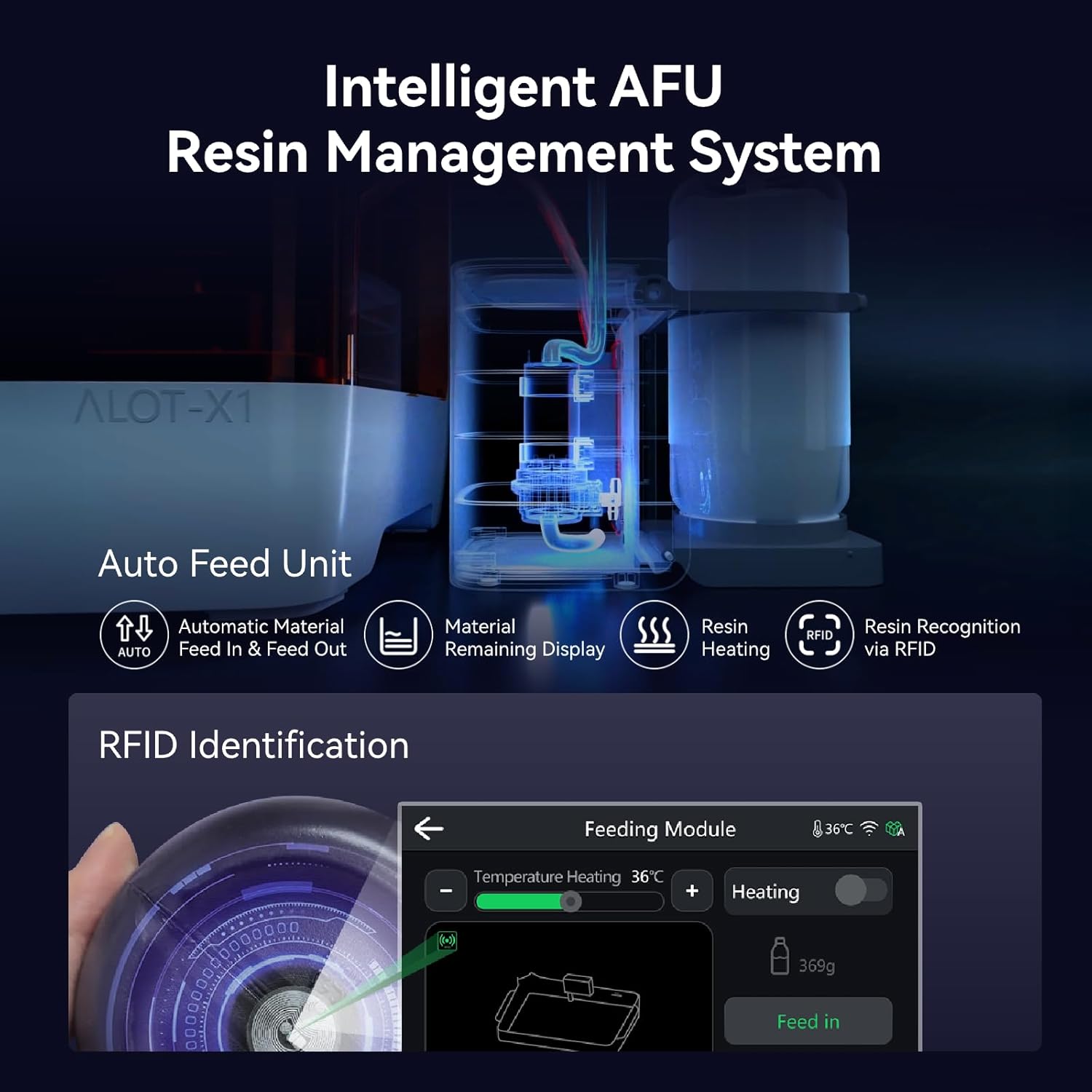 - Intelligent Resin Management: The Intelligent AFU Resin Management System makes the Creality resin 3D printer smarter with resin heating (30–45°C in 3 minutes) to reduce viscosity and improve print success. RFID tag recognition loads resin parameters automatically, while laser detection enables feeding and recycling of leftover resin. Real-time weight monitoring ensures enough material for each print.
