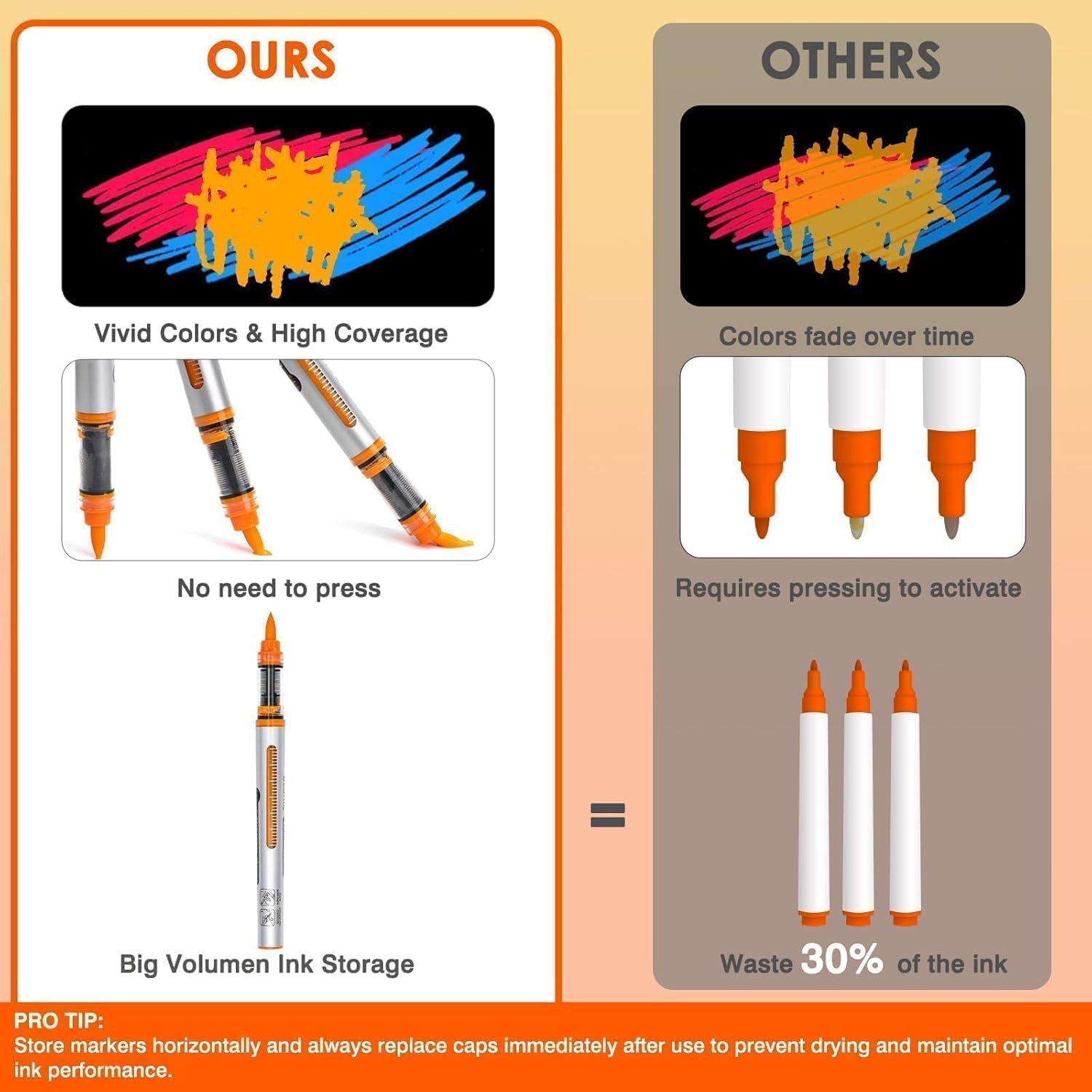- Quick-Dry & High Coverage: These acrylic paint pens are filled with premium acrylic ink that dries quickly, offers strong opacity, and resists fading. Once dry, your artwork becomes water-resistant, long-lasting, and vibrant.