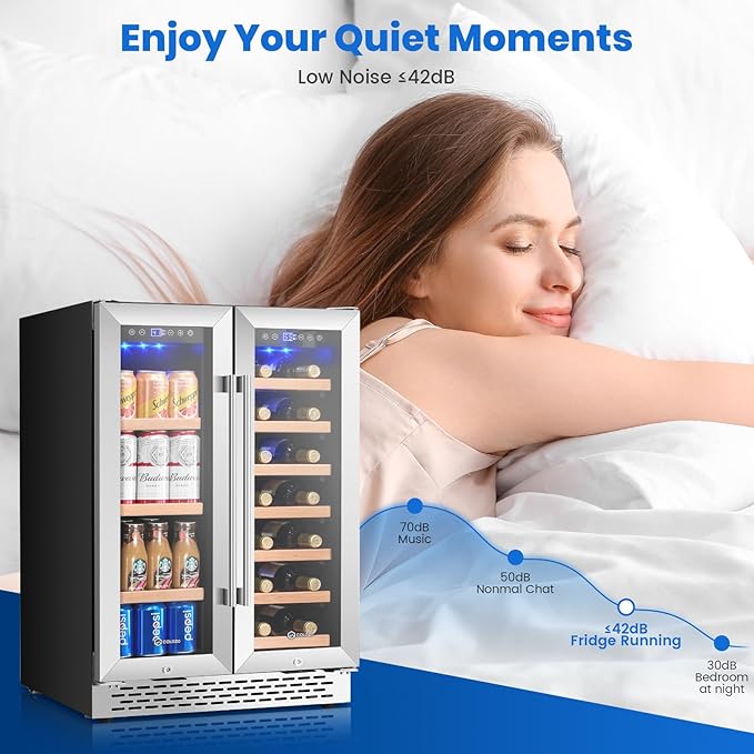- 【High Performance & Ultra Quiet Cooling】The compressor wine and beverage refrigerator is equipped with an advanced cooling and circulation system that combines strong power and low-vibration operation. The beverage refrigerator maintains precise humidity control while cooling quickly and continuously. This better maintains the taste and quality of the drinks. The under counter refrigerator has minimal vibration when running, with a decibel level below 38, which will not affect normal work and life. The automatic defrost function also reduces condensation and the times of fridge cleanings