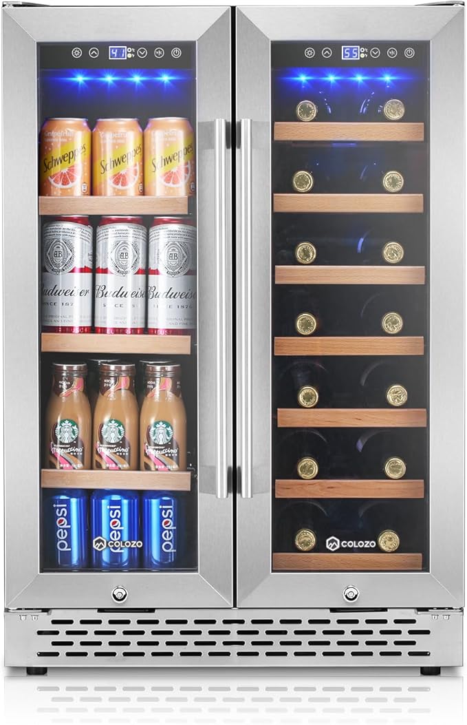 - 【Dual Zone Precision Temp Control】COLOZO 24" Dual Zone Wine Beverage Refrigerator uses advanced cooling technology to achieve a precise temperature storage environment. (Left zone: 35-50°F Right zone; Left zone: 41- 64°F. )The dual-zone design gives you the flexibility to store wine and chill beverages in optimal conditions. Its spacious capacity can accommodate up to 20 bottles of 750ml standard Bordeaux wine and 88 12oz standard cans of wine, giving you plenty of space to collect a variety of wines