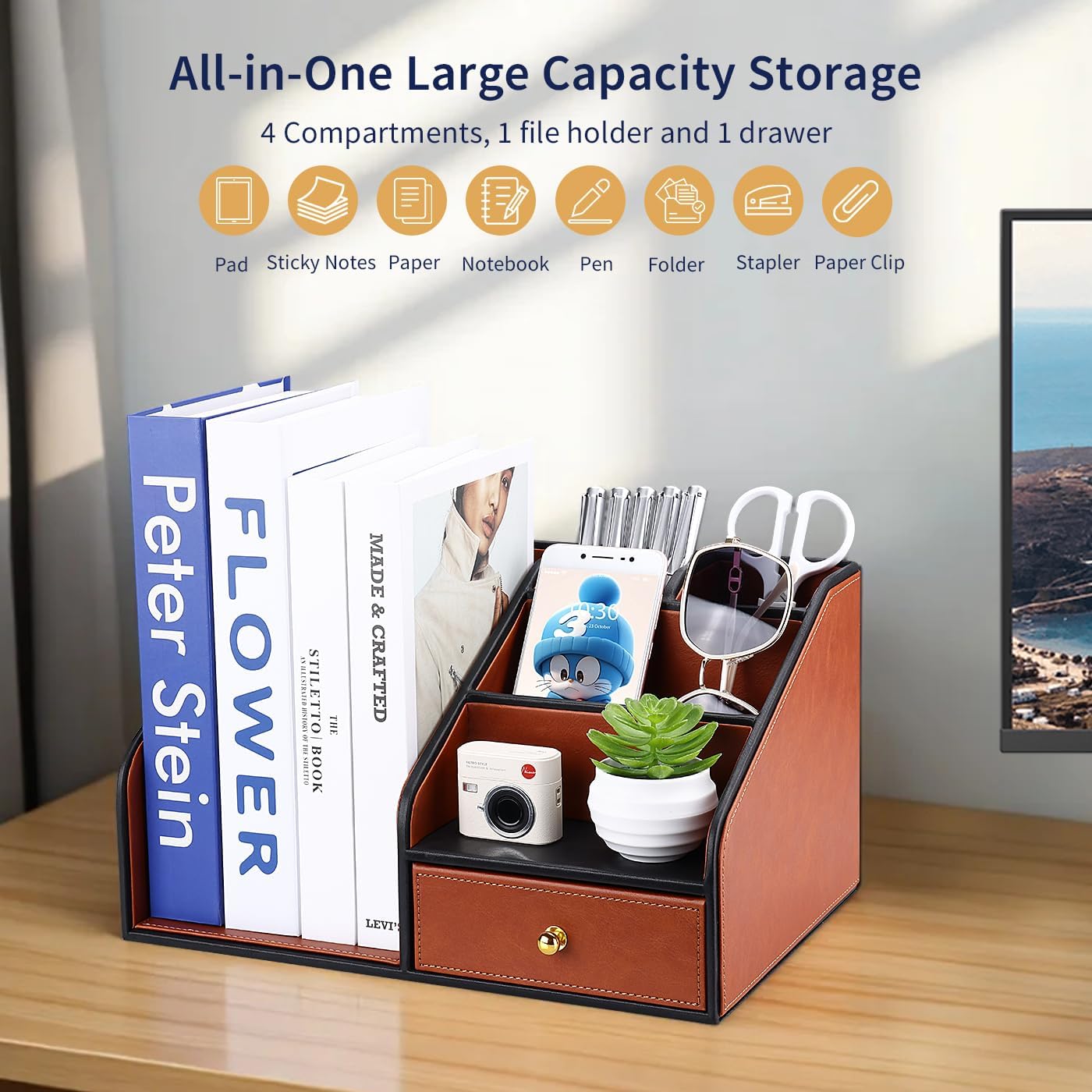 - 【 Multifunctional Desktop Organizer】 Designed with 4 compartments, a vertical file holder, and a drawer, this GORESE Luxury Office Series leather desk organizer keeps your workspace essentials—like files, folders, books, pens, scissors, notebooks, sticky notes, paper clips, and even your phone or tablet—neatly stored and easily accessible.