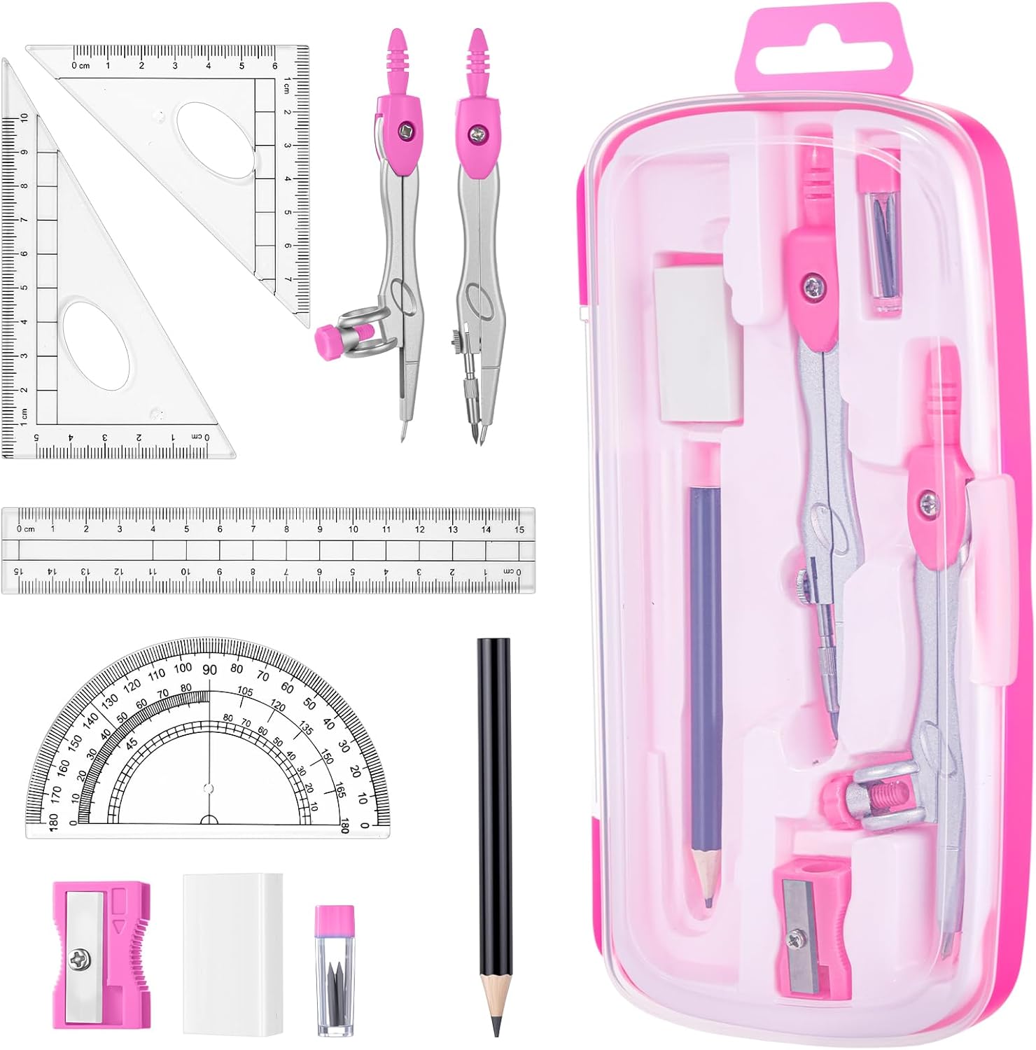- Package Includes: the geometry set includes 2 compasses, 2 triangles, 1 ruler, 1 protractor and 1 pencil, 1 eraser, 1 sharpener, and 1 box of pencil lead refill, ensuring that you have all the tools you need for precise geometry calculations