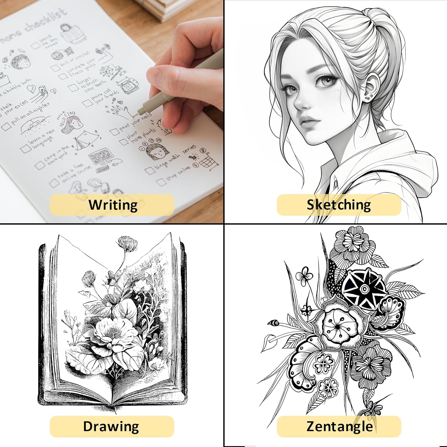 - Archival-Quality Pigment Ink – Waterproof & Fade-Resistant:XWT fineliner pens use rich black water-based pigment ink that is quick-drying, waterproof, sunproof, acid-free, and non-toxic. No smearing, ghosting, or bleeding through paper – ideal for long-lasting artworks, technical drawings, and note-taking.