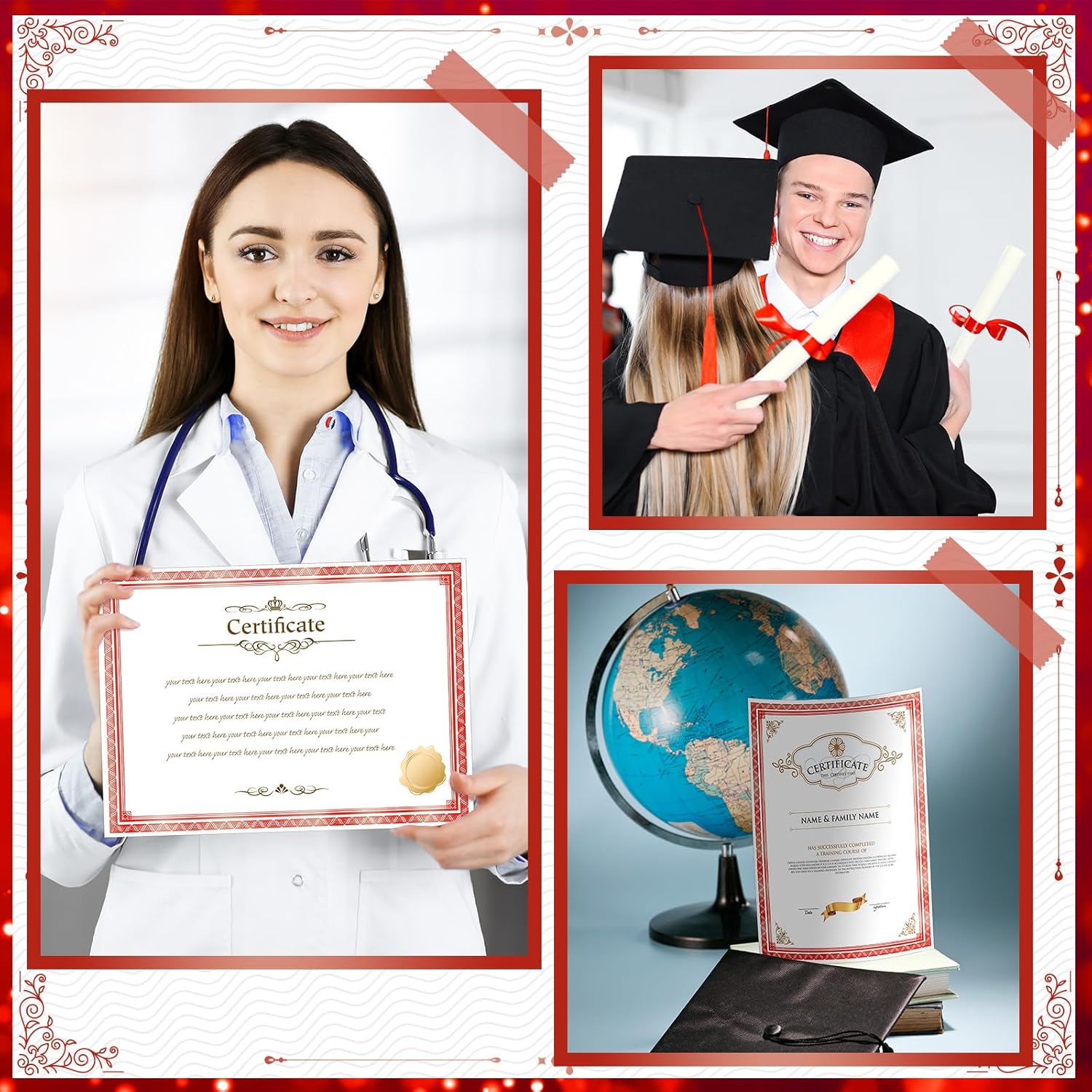 - Red Foil Certificate Paper: this certificate paper is elegantly framed with an exquisite gold foil border, with a vintage paper effect, very suitable for small businesses, recognizing the employee of the month, student of the month, office achievements, and graduation ceremony