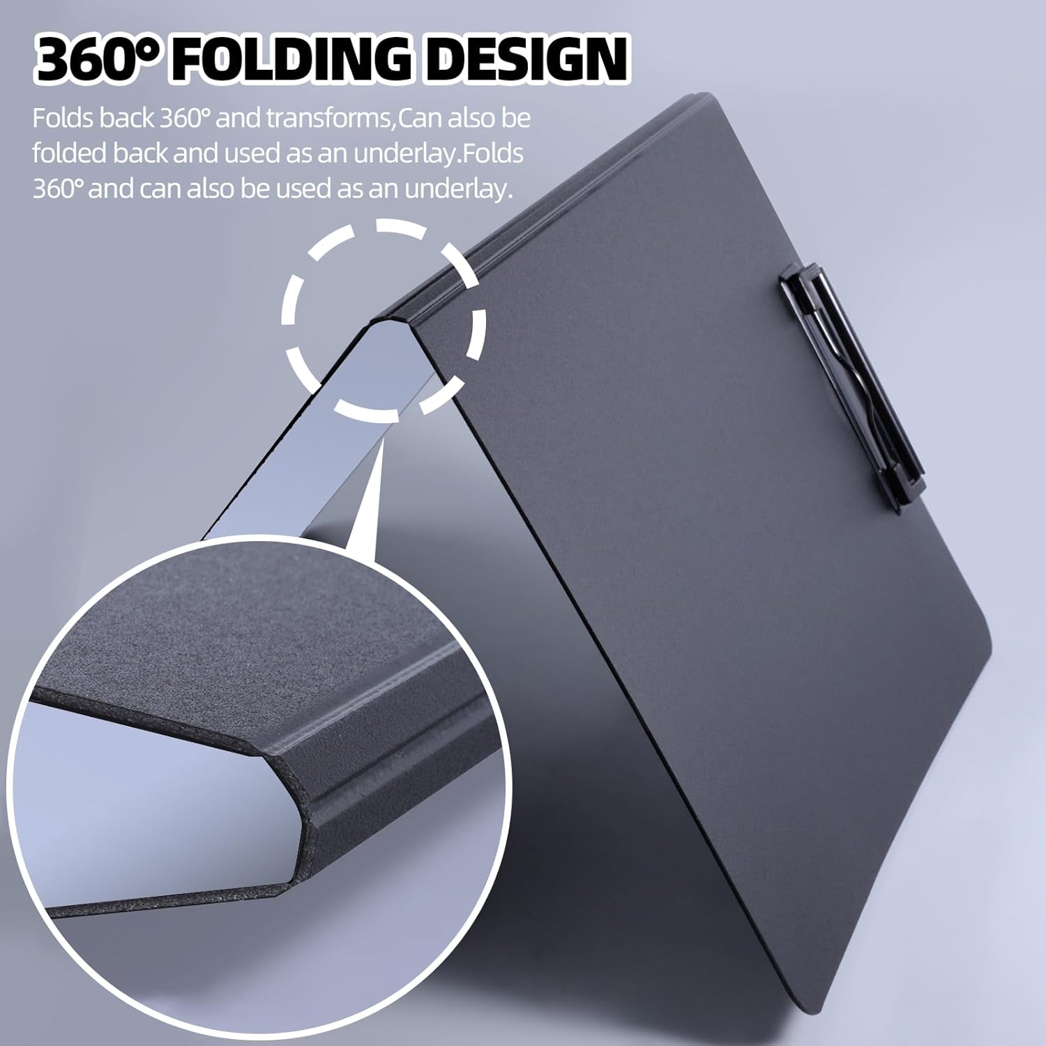 - Easy to use: This foldable clipboard can be folded 360 degrees without deformation; Horizontal and vertical two clips facilitate multi-angle use, 0.07 inch thick board provide a smooth writing experience; This clipboard with pen slot in the upper left corner; Rounded edges are sanded, won't hurt your hands