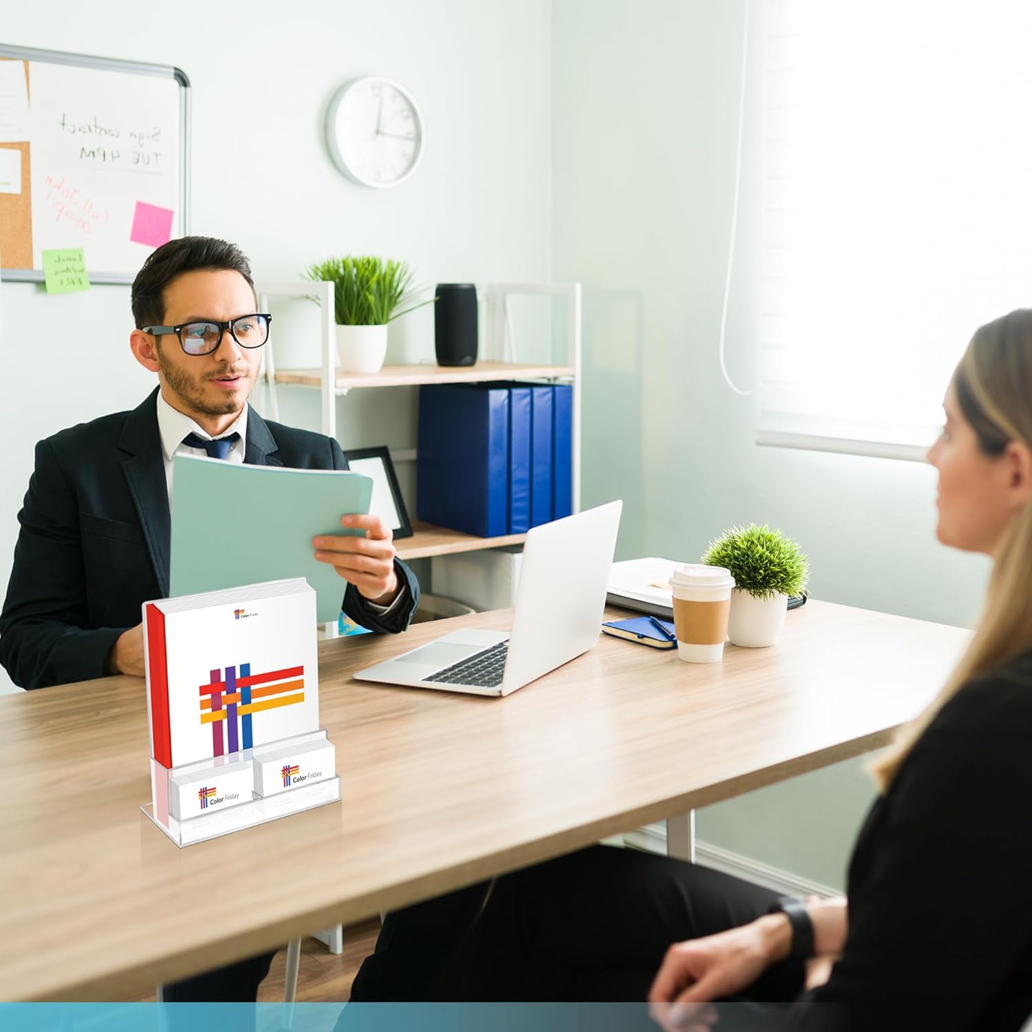- OPTIMAL VISIBILITY AND BALANCED ANGLE Crystal clear design of business card and brochure holder keeps brochures and business cards fully visible for easy viewing. 83° angled design of pamphlet holder display stand offers optimal visibility to your materials.
